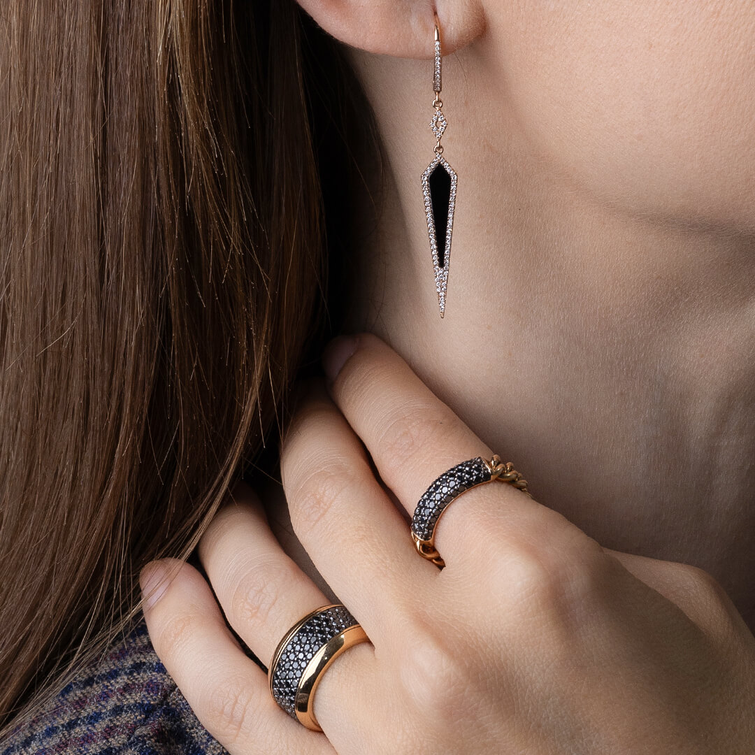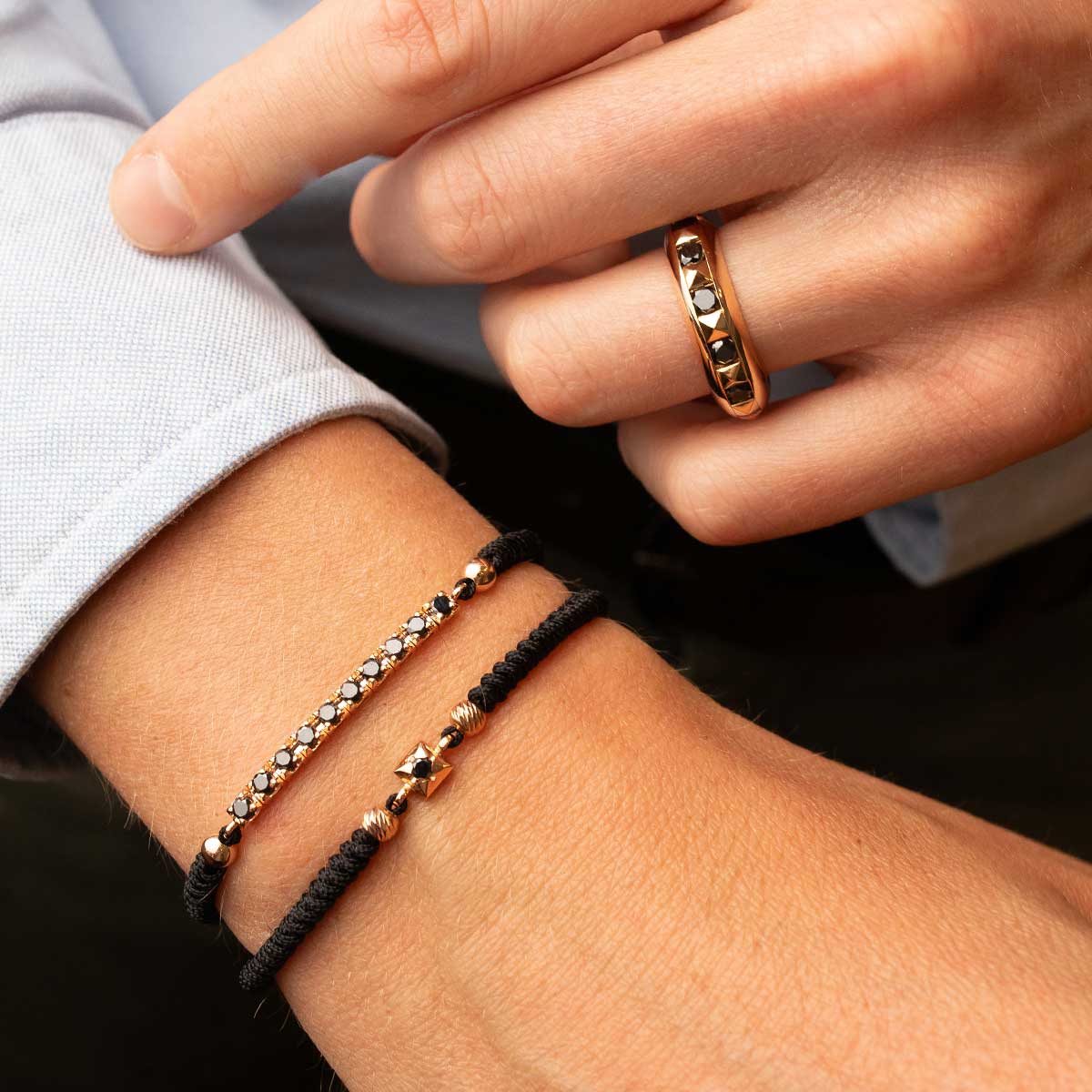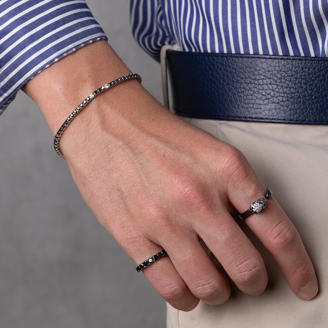 The "Olga" ring Crafted from the highest quality materials, this ring features a continuous row of black diamonds that sparkle with irresistible magnetism, while the "John" ring in white gold, ruthenium and diamonds. Its bold and sophisticated design makes it the perfect accessory to make you feel like a true rock star.