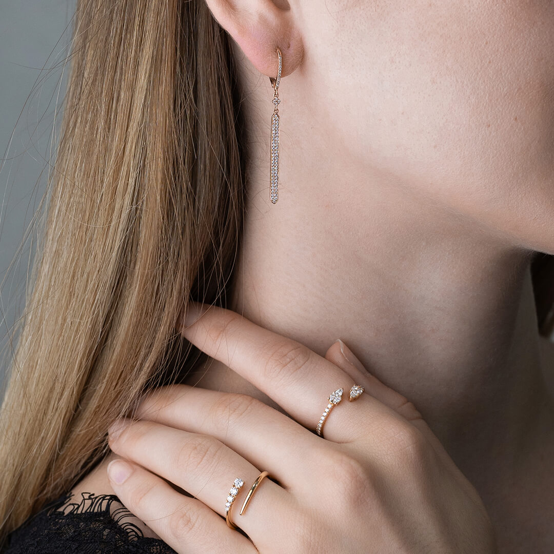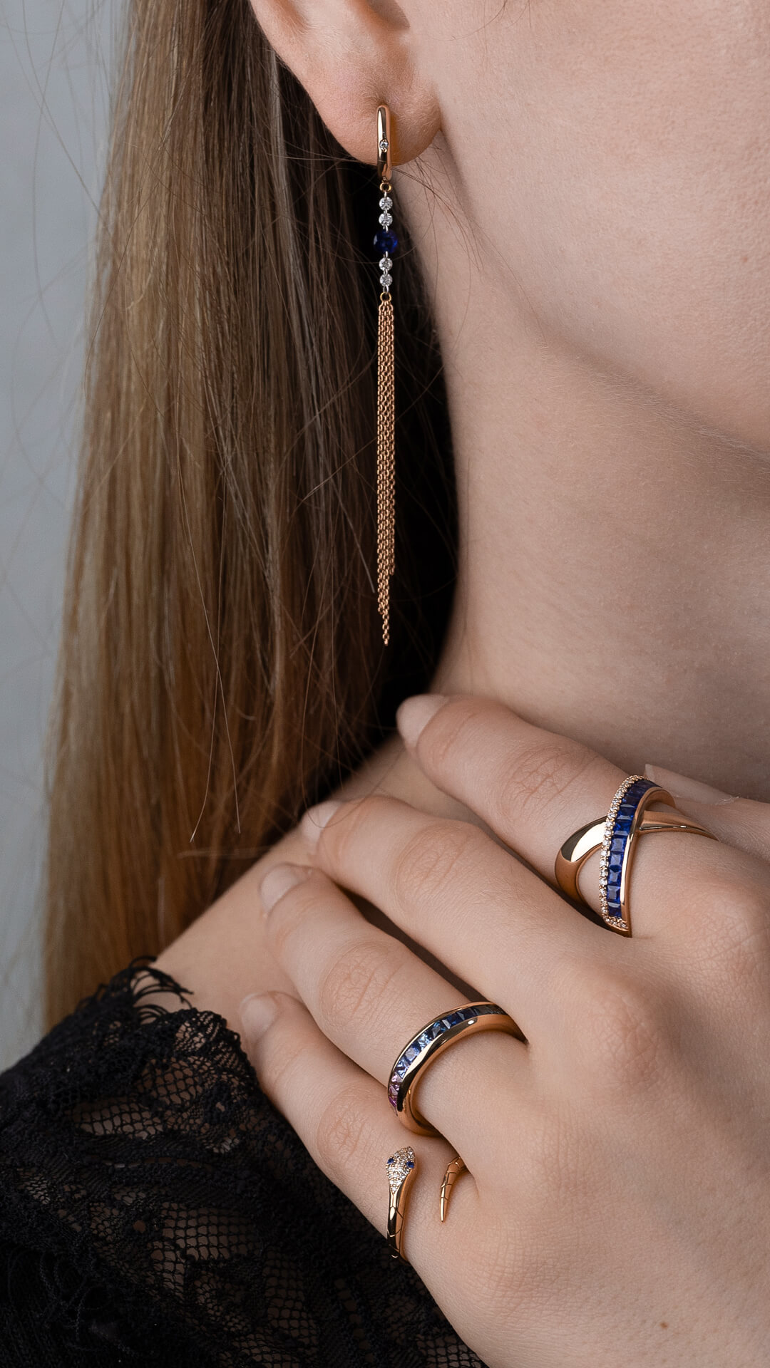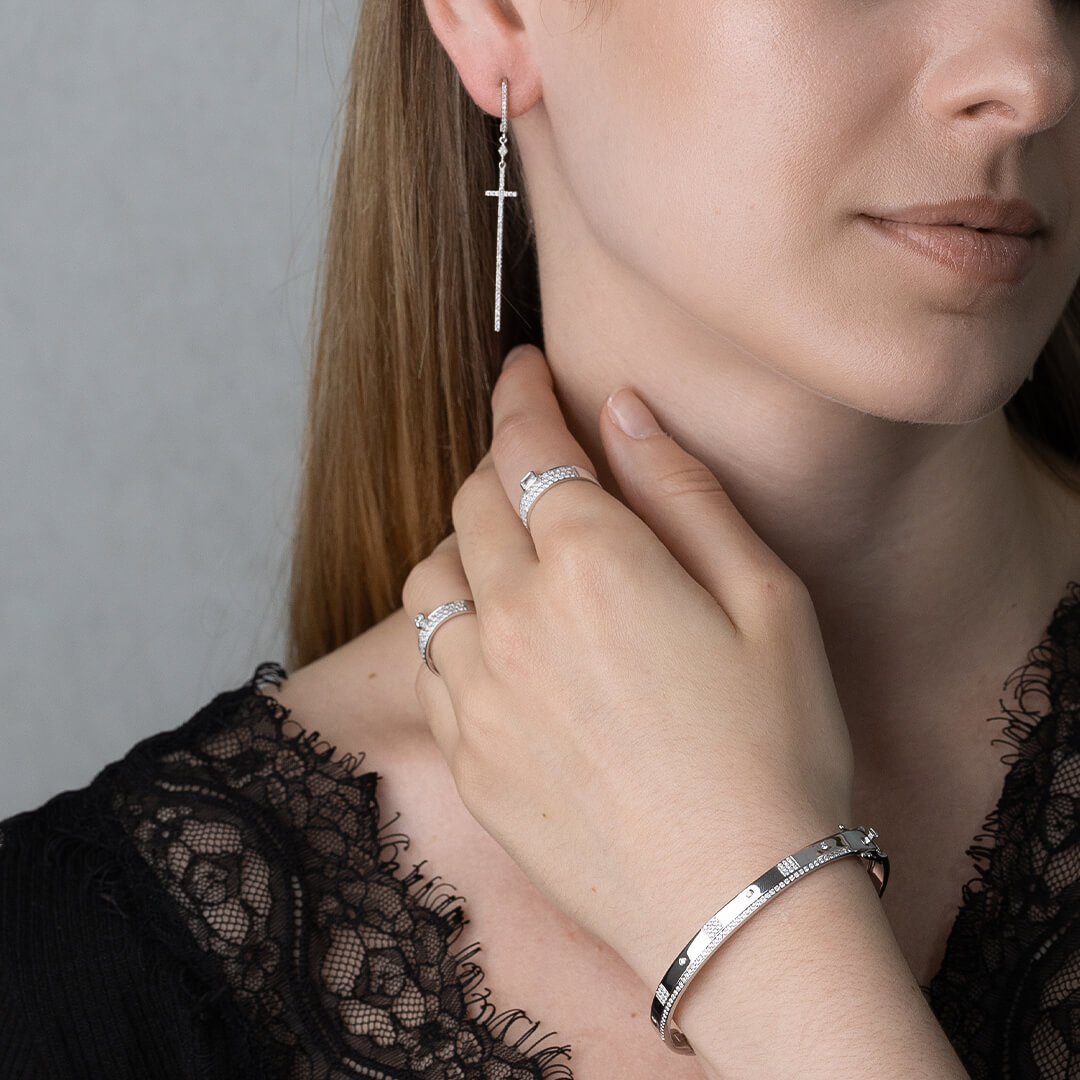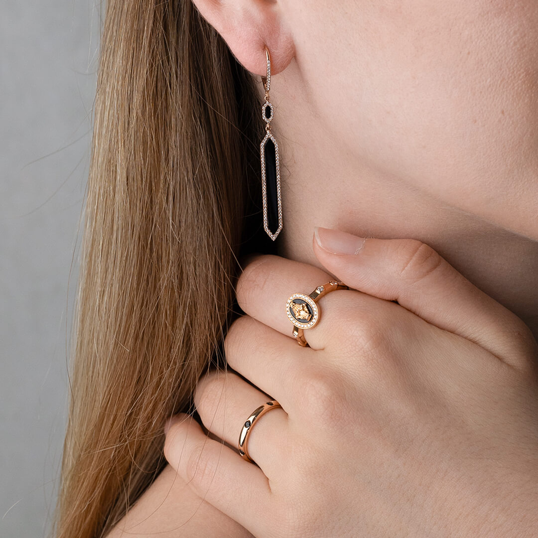 The "Olga" ring Crafted from the highest quality materials, this ring features a continuous row of black diamonds that sparkle with irresistible magnetism, while the "John" ring in white gold, ruthenium and diamonds. Its bold and sophisticated design makes it the perfect accessory to make you feel like a true rock star.