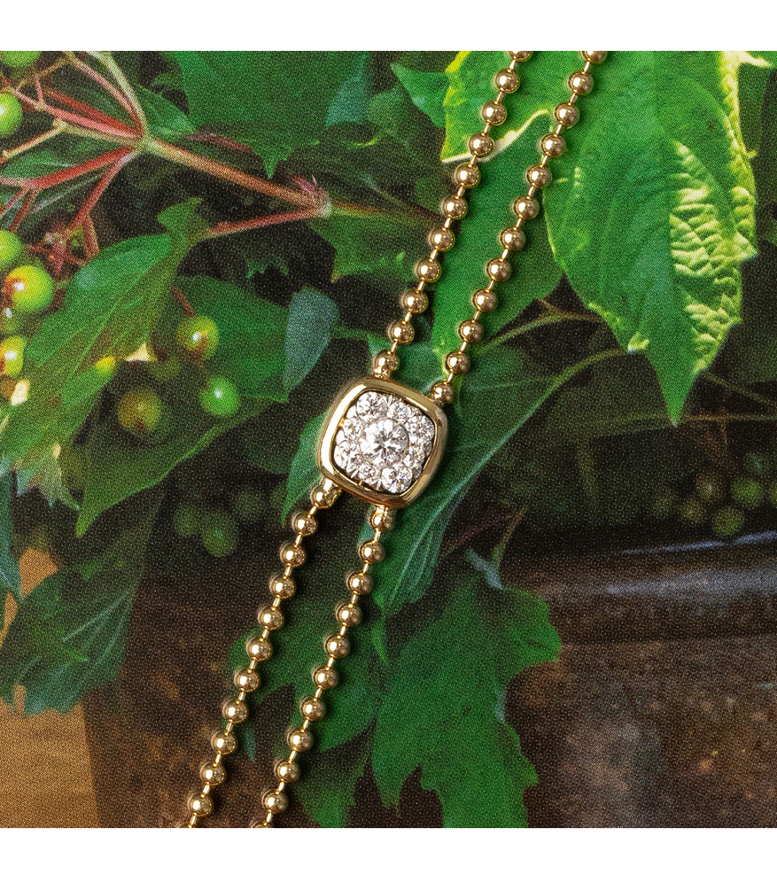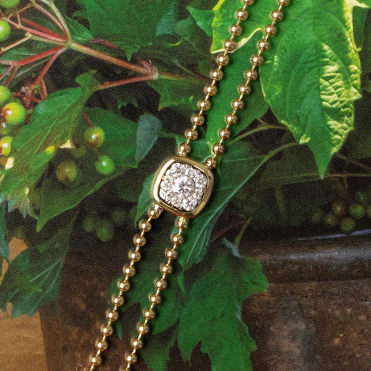 Bracelet “Rocio” double chain of yellow gold beads with round-cut diamonds pavé (0.33 cts). Perfect alone or combined, an unforgettable gift!