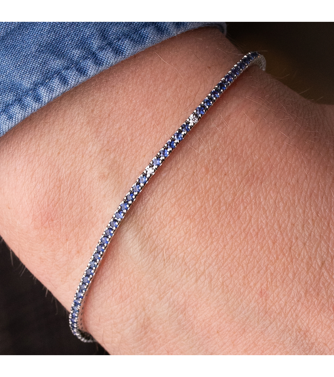 Avery” riviere bracelet in white gold with round-cut sapphires 1.30 Cts. and round-cut diamonds 0.05 Cts. A dazzling classic.