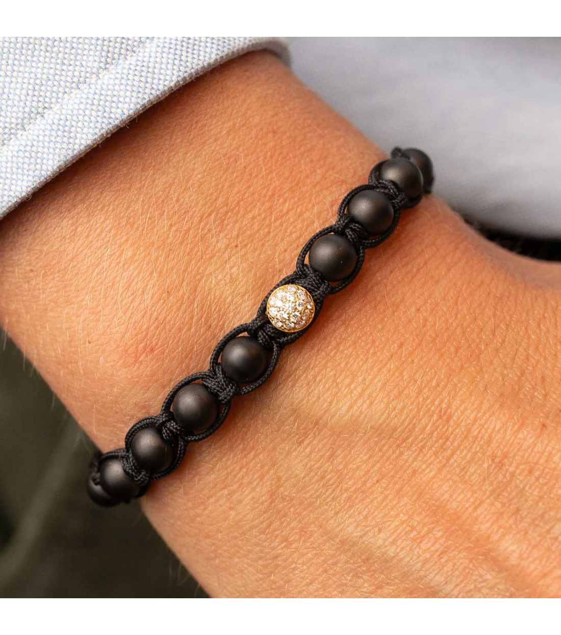 BRACELET ‘GAMAL’ IN BLACK THREAD, CERAMIC, DIAMONDS AND PINK GOLD