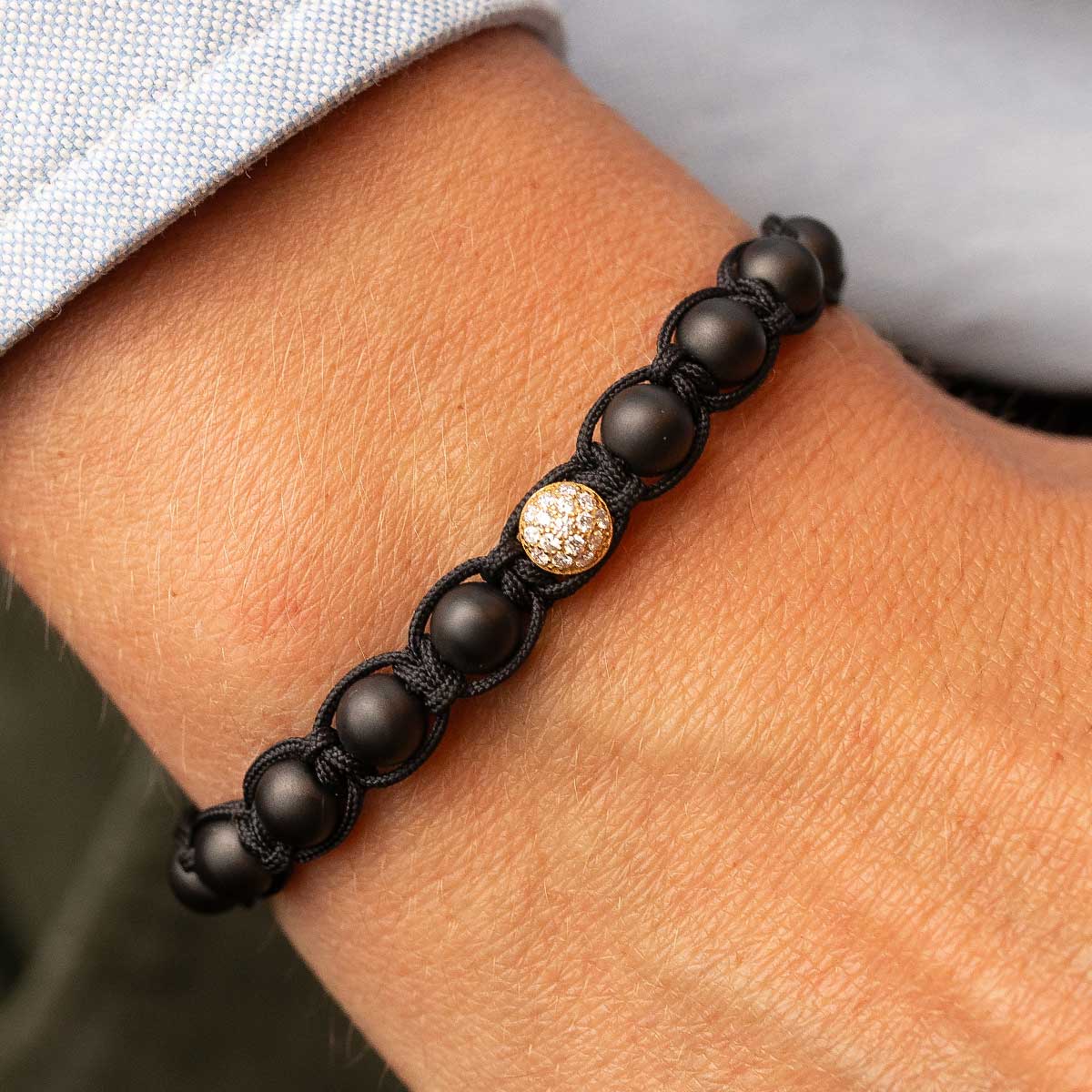 Gamal’ macramé bracelet made of black thread, ceramic charms, 18kt rose gold with round-cut diamonds 0,16Cts. Comfort and style to match any look.