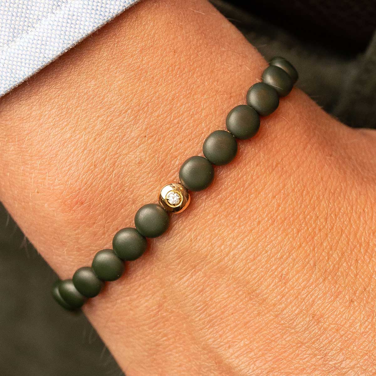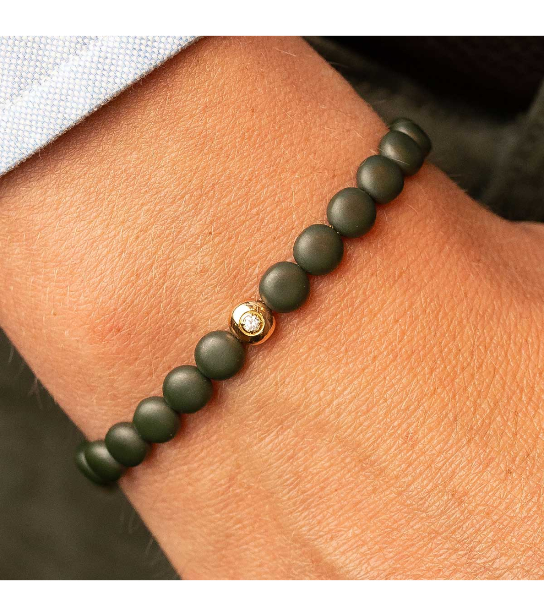 Macrame bracelet ‘Jinan’ made in green thread, ceramic charms, 18kt rose gold with round-cut diamond 0,03Cts. Comfort and style to match any look.