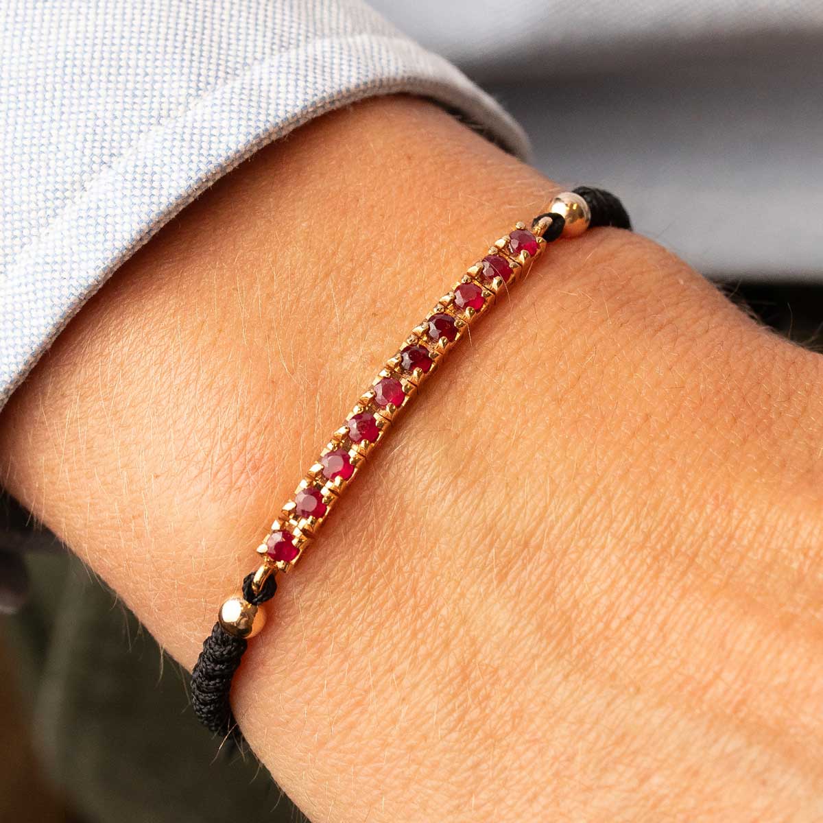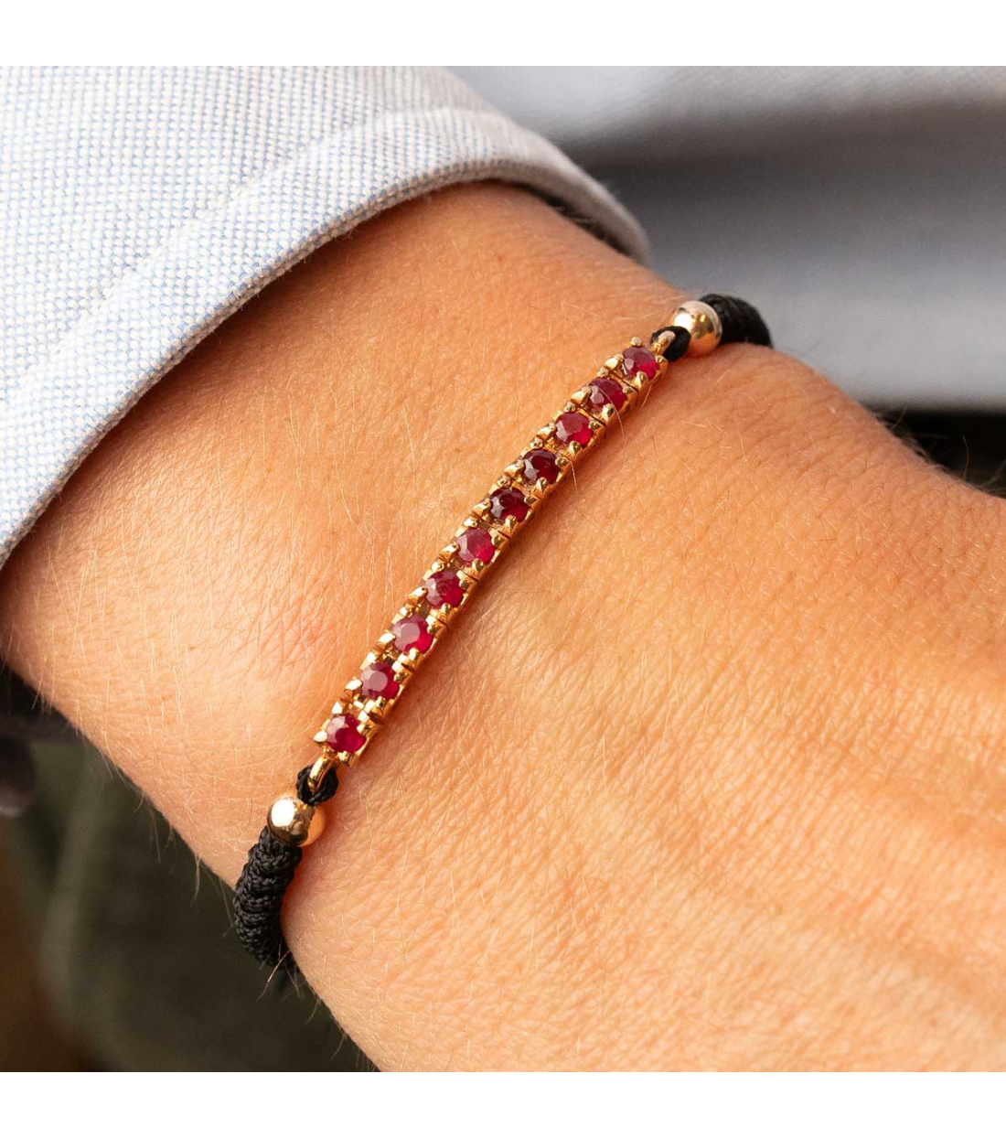 Oliver’ bracelet in black thread with central rose gold bar with round-cut rabies 0,65Cts. Designed to captivate lovers of fine jewellery.