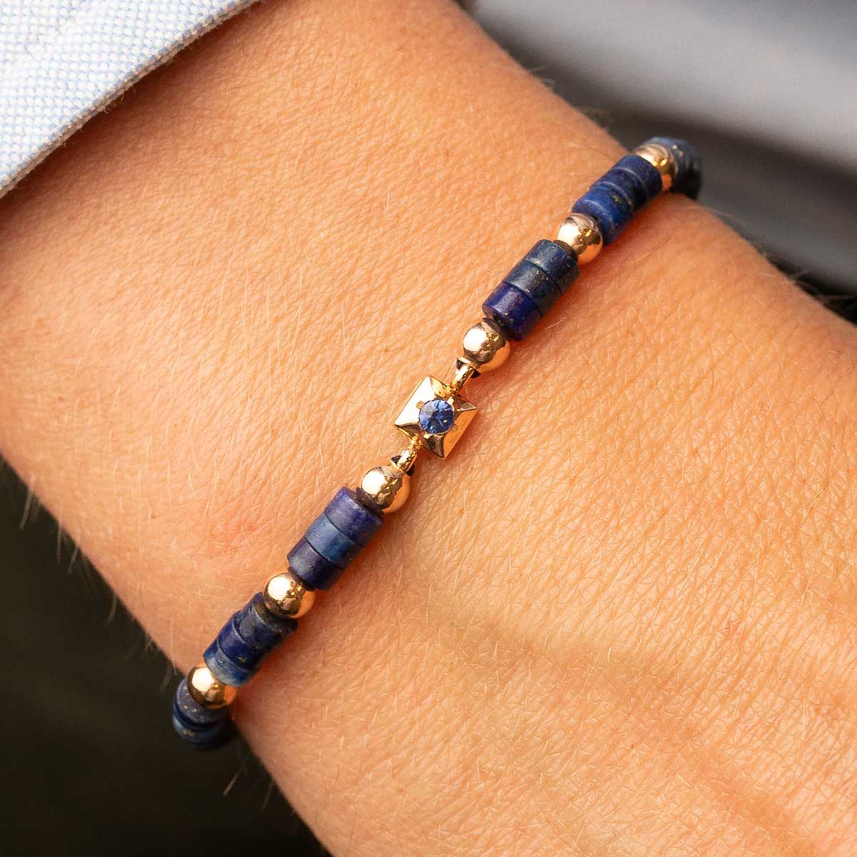 BRACELET ‘ADONIS’ MADE OF THREAD WITH ROSE GOLD, LAPIS LAZULI AND SAPPHIRE CHARMS