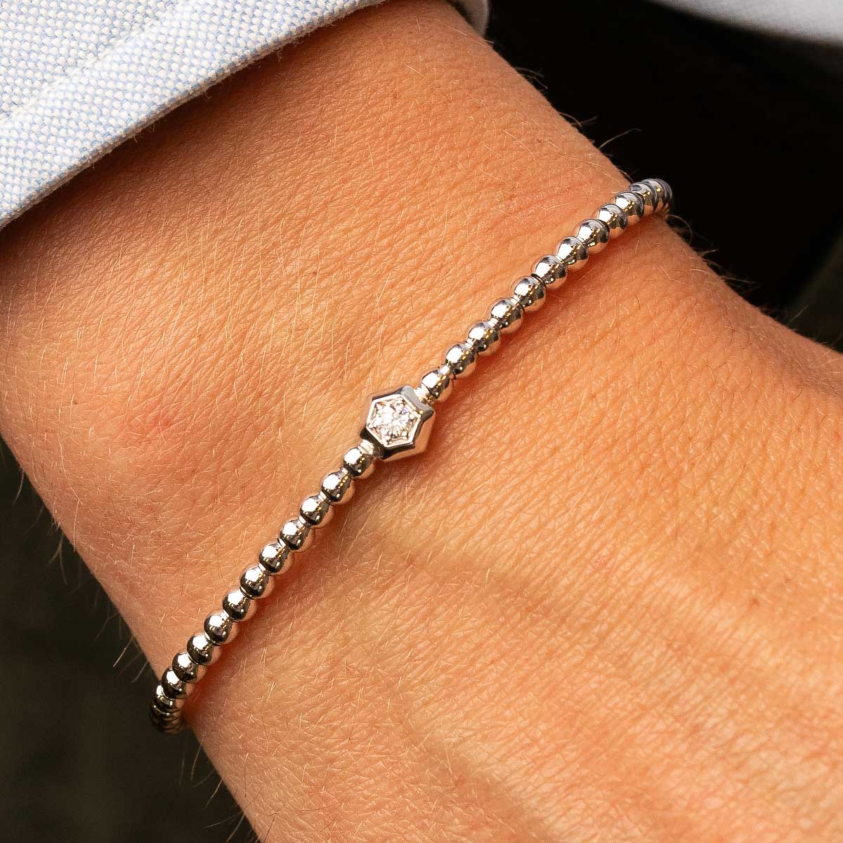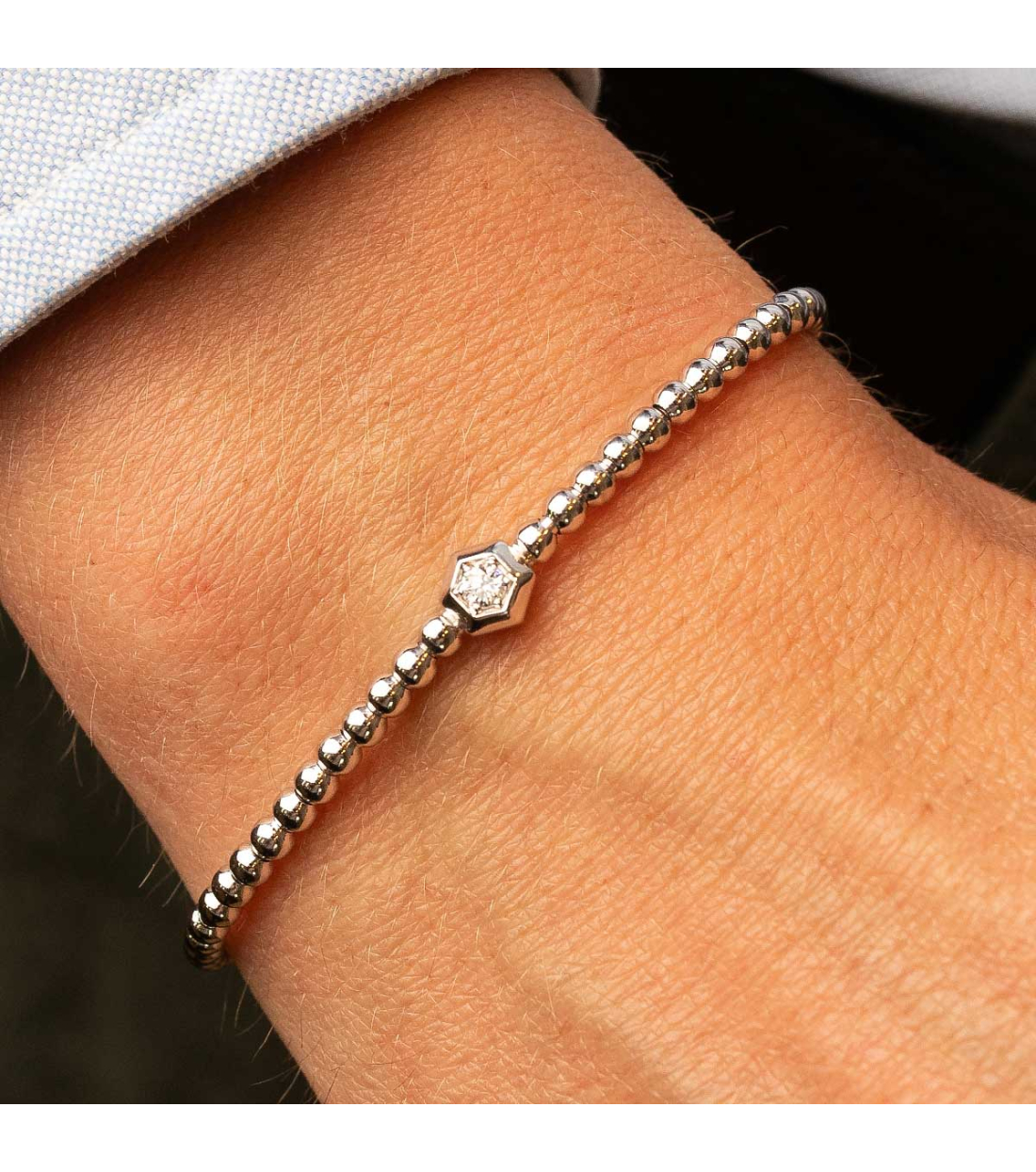 Calix’ elastic bracelet in 18kt white gold with a round-cut diamond 0,10Cts. Subtle elegance, ideal to combine with any style.