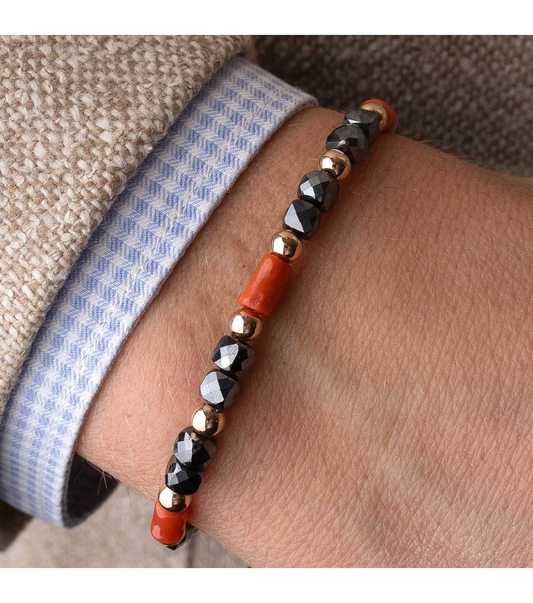 The "Milo" macramé bracelet in black thread combines the intensity of hematite with the warmth of red coral and the elegant sparkle of 18K yellow gold. It adapts naturally to both casual looks and more formal or evening styles.
