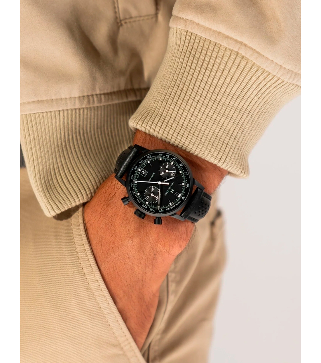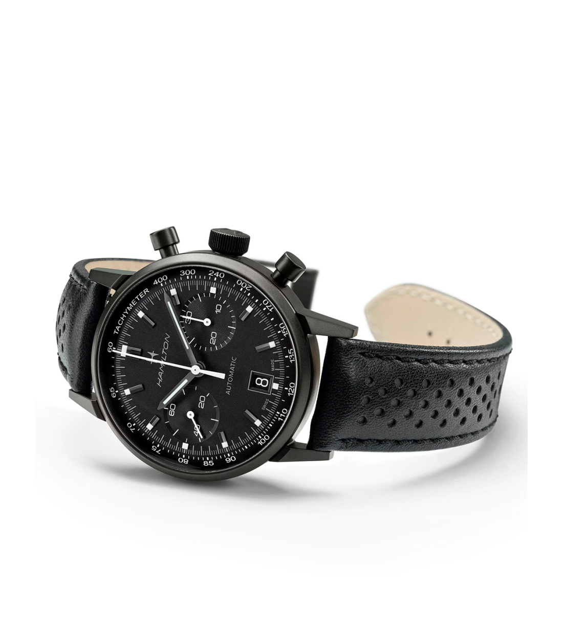 Inspired by its 1968 racing origins, the Intra-Matic Auto Chrono welcomes a new interpretation of its iconic design. The 40 mm PVD-coated case, all-black dial and perforated strap, a modern take on a vintage classic, add a contemporary twist to a historic model dating back to the 1970s. Discover our collection of vintage-inspired Intra-Matic watches.