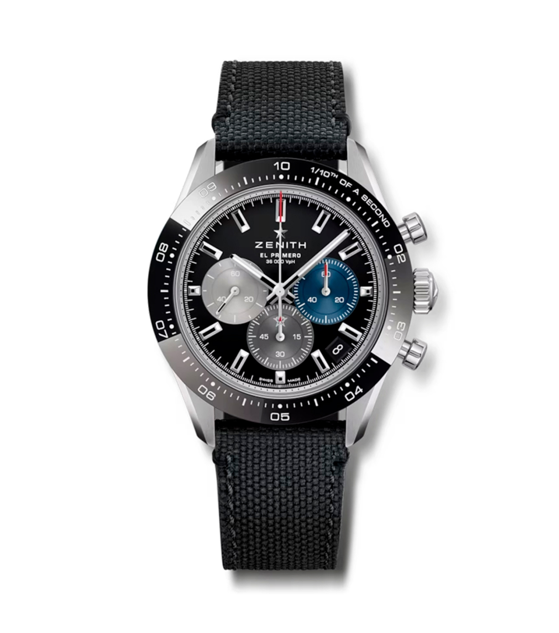 The CHRONOMASTER Sport combines elements of past ZENITH chronograph references such as the tri-colour dial, pump-style pushers and steel bracelet with a black ceramic bezel, all in a modern 41mm case. This version features a black dial paired with a black rubber strap. Powered by the El Primero 3600 1/10th of a second automatic chronograph movement.