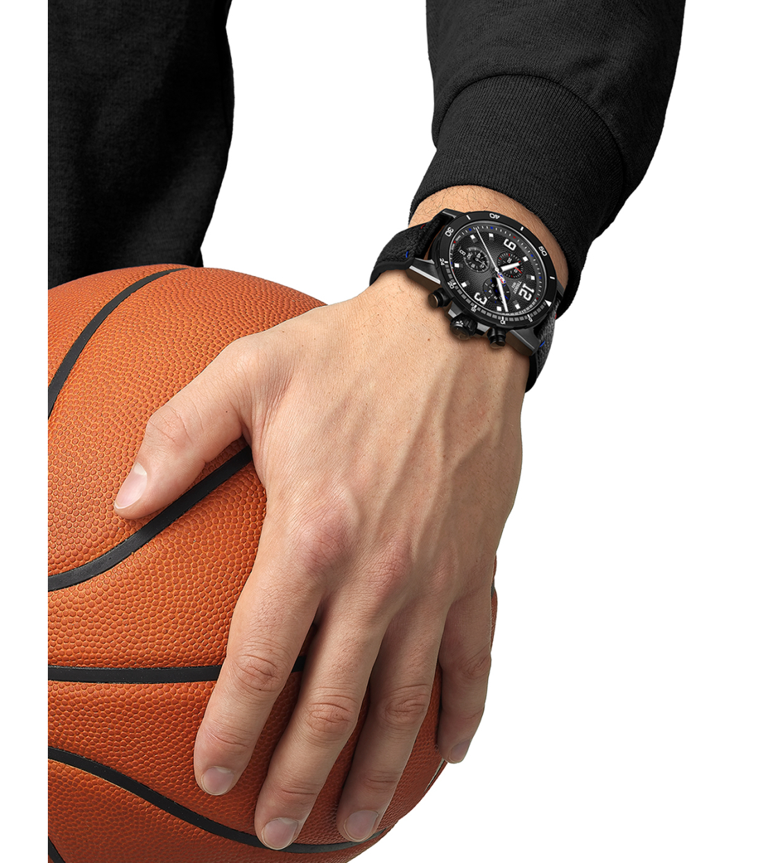 The NBA Supersport Special Edition pays tribute to basketball with a sporty style and detailing. The 45 mm case in black PVD-coated stainless steel features a bezel incorporating the 24-second rule, inspired by the NBA shot clock, with coloured details alluding to the league. The dial, with a basketball dot pattern and a dark grey to black gradient at the edges, creates an illusion of depth that mirrors the shape of the ball. Numeral indices, like those on players' jerseys, add a significant touch, while the NBA logo on the seconds hand is a further homage to the sport. The black bi-material bracelet complements the texture of the dial, making it perfect for everyday wear and physical activities. Meanwhile, the case back holds the real hidden gem: intricate engravings of the NBA logo, surrounded by the cities and states for which the teams are named in both the Western and Eastern Conferences. This watch features a quartz chronograph movement, which provides accurate timekeeping with minimal maintenance.