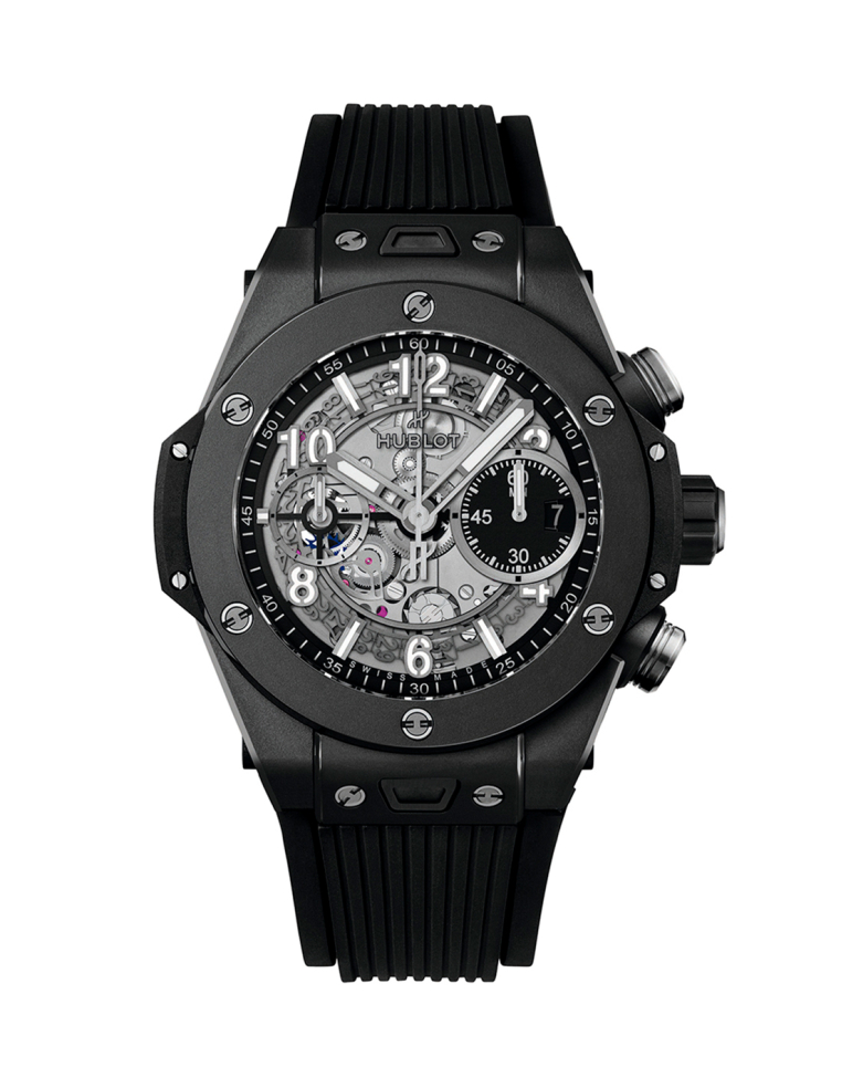 Hublot watch with polished and sandblasted black ceramic case. Diameter 42 mm. Polished and sandblasted black ceramic bezel. 6 H-shaped titanium screws. Water-resistant to 100 m or 10 ATM. Sapphire crystal with anti-reflective treatment. Matte black skeleton dial. Movement HUB1280 UNICO Manufacture Automatic chronograph Flyback movement with column wheel. Power reserve 72 hours. Structured black rubber strap. Black ceramic and titanium deployant buckle clasp with black plate.