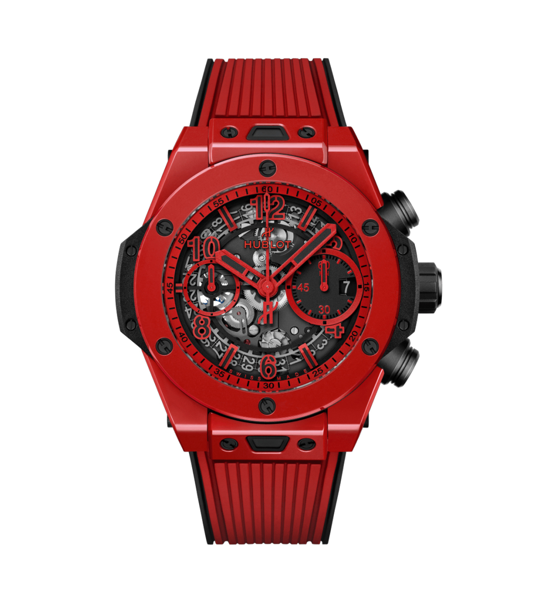 Polished red ceramic case. Diameter 42 mm. Polished red ceramic bezel with 6 titanium screws with black H-shaped plate. Water-resistant to 100 m or 10 ATM. Sapphire crystal with anti-reflective treatment. Matt red skeleton dial. HUB1280 UNICO Manufacture Automatic chronograph Flyback movement with column wheel. Power reserve 72 hours. Black and red rubber straps structured with stripes. Black ceramic and titanium deployant buckle clasp with black plate.