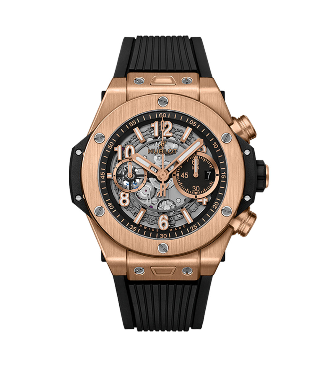 Hublot watch with case in satin-brushed and polished 18K King Gold. Diameter 42 mm. Bezel in 18K satin-brushed and polished King Gold with 6 H-shaped titanium screws. Water-resistant to 100 m or 10 ATM. Sapphire crystal with anti-reflective treatment. Matt black skeleton dial. HUB1280 UNICO Manufacture Automatic chronograph Flyback movement with column wheel. Power reserve 72 hours. Deployment buckle clasp in 18K King gold and titanium with black plate.