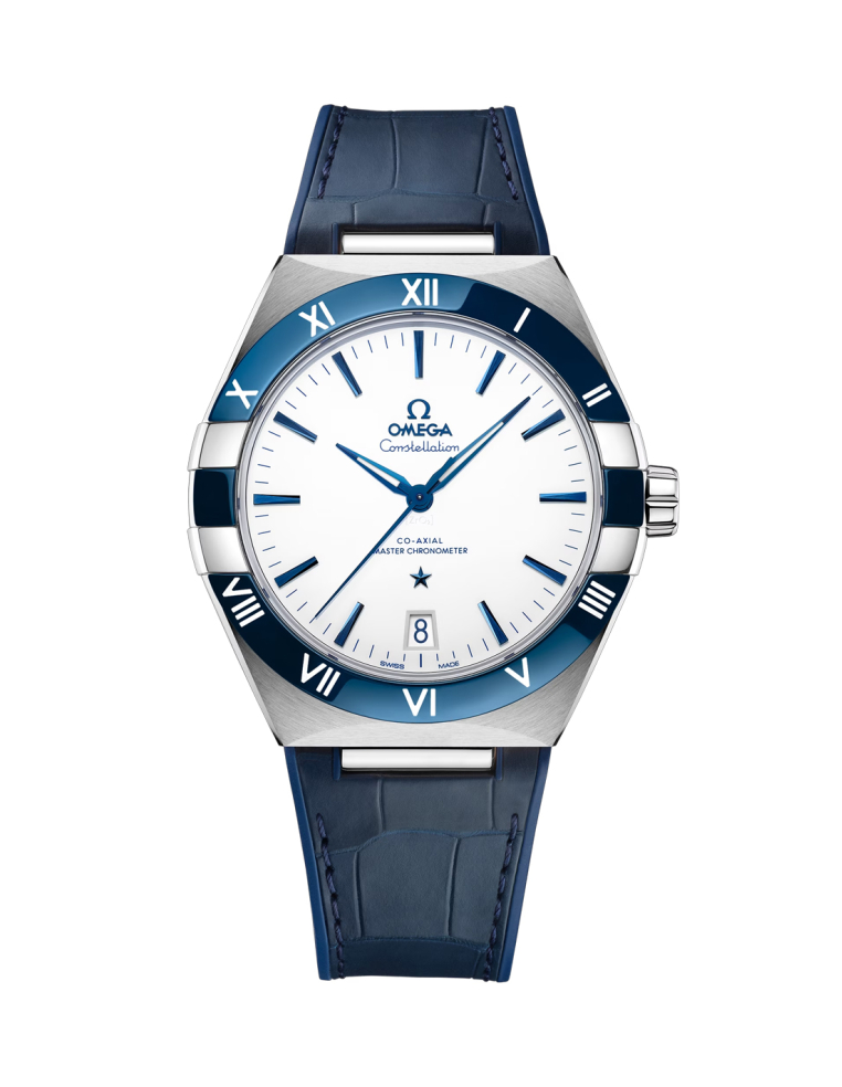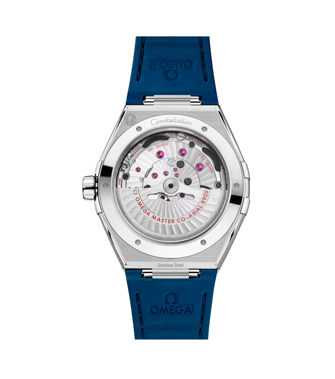 The hands, OMEGA logo, Constellation star and faceted hour-markers are blued. This timepiece, presented on a blue rubber-coated leather strap, is powered by the OMEGA Co-Axial Master Chronometer Calibre 8900, visible through the scratch-resistant convex sapphire crystal.