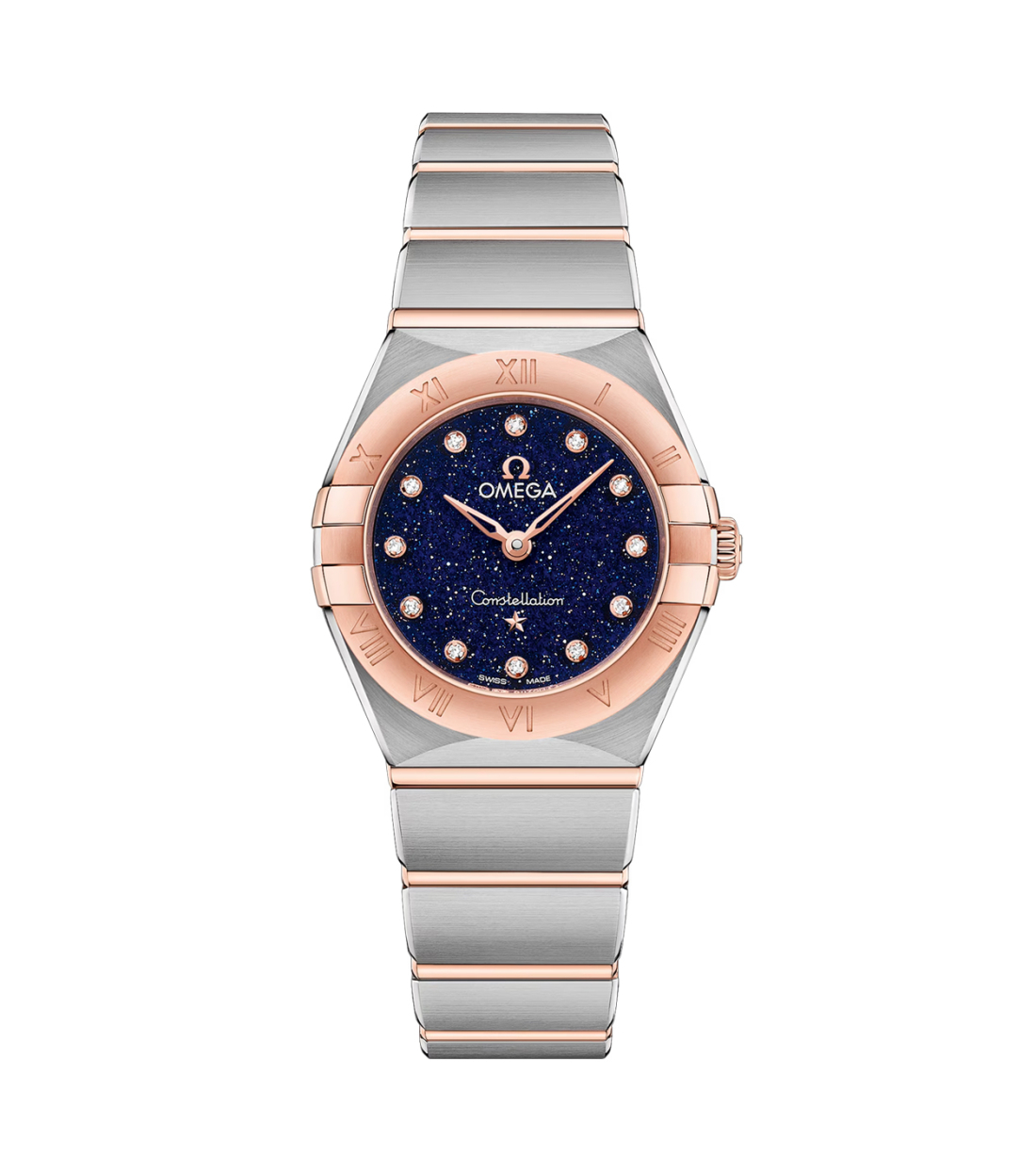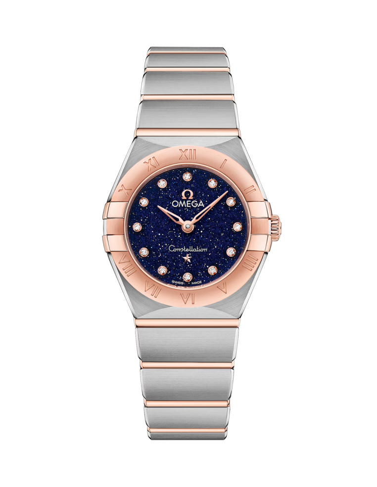 This 25 mm model in 18 Ct Sedna™ gold and stainless steel has a bezel with engraved Roman numerals and a blue venturine crystal dial with diamonds as hour markers. The hands, OMEGA logo, Constellation star and diamond settings are also made of 18 Ct Sedna™ gold.