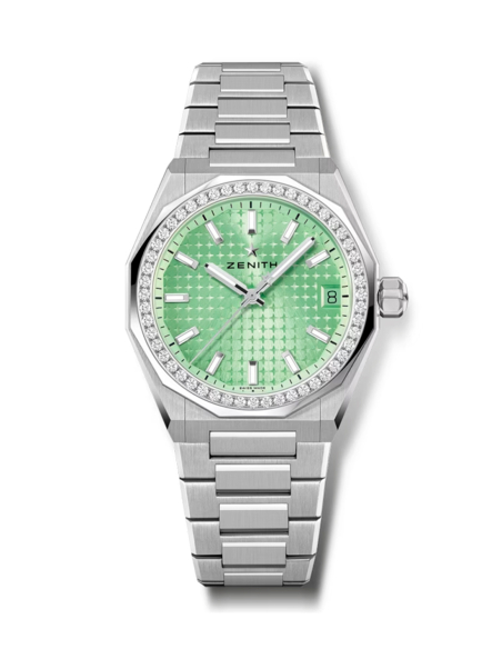 The DEFY Skyline has a 36 mm octagonal steel case with a faceted bezel set with diamonds and features a dial with a pastel green metallic sunray motif reinterpreting ZENITH's emblematic four-pointed star. It is equipped with the Elite 670 automatic manufacture movement. It is fitted with an interchangeable steel bracelet and a rubber strap with a green motif. To make the most of the watch's principle of interchangeable components, a second strap is included.