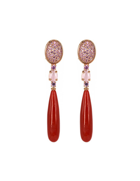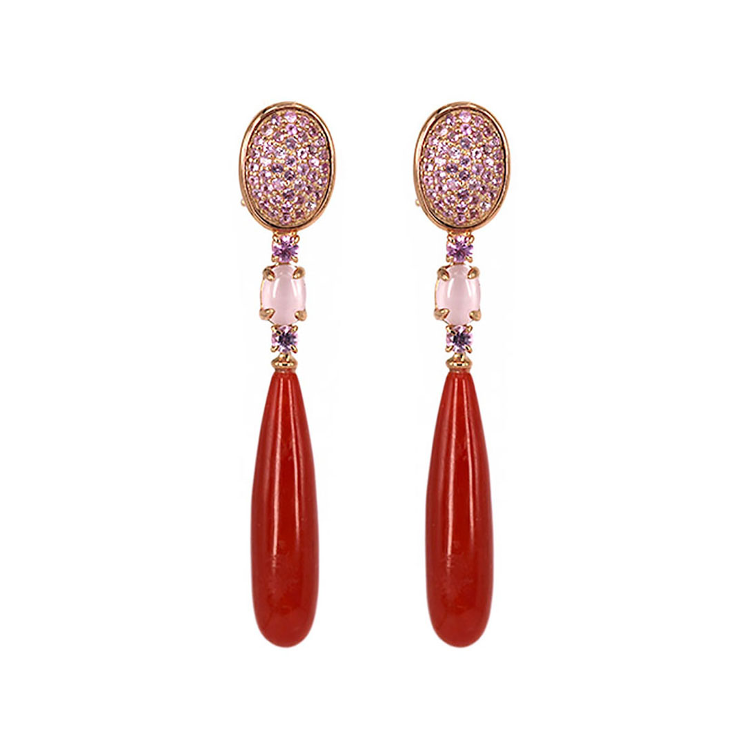 Herse" long earrings in rose gold, rose quartz, pink sapphire and coral. Elegance and Sophistication for a Triumphal Entry.