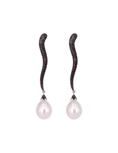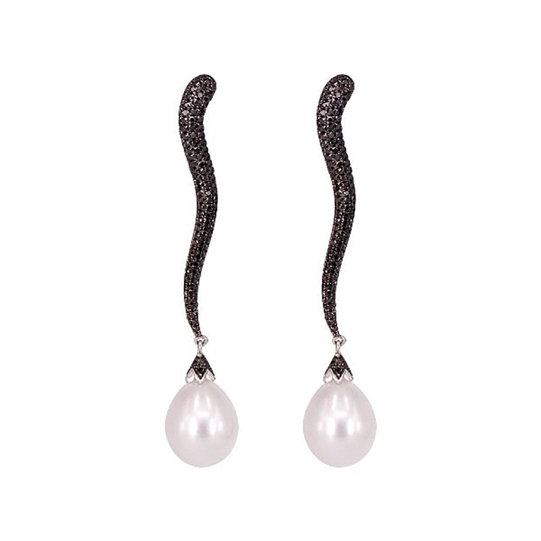 Long earrings “Selena” 18kt. white gold with round-cut black diamonds (0.66 cts.) and pearl. Elegance and Sophistication for a Triumphal Entry.