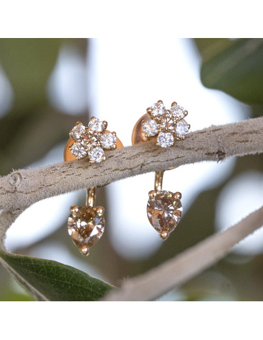 Rose gold lobe earrings with round-cut diamonds (0.22 cts fsi), round-cut brown diamonds (0.10 cts) and drop-cut diamonds (0.66 cts). Snap clasp.