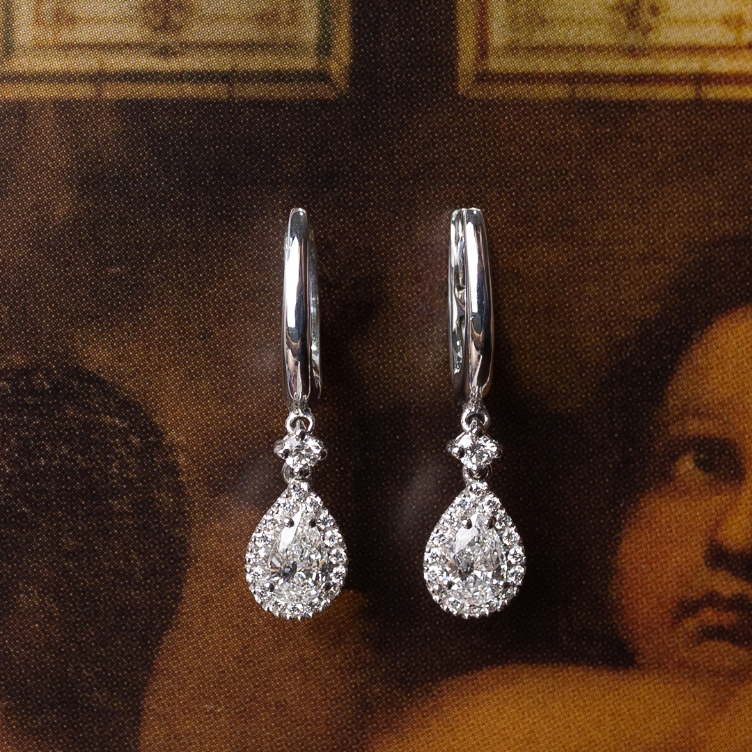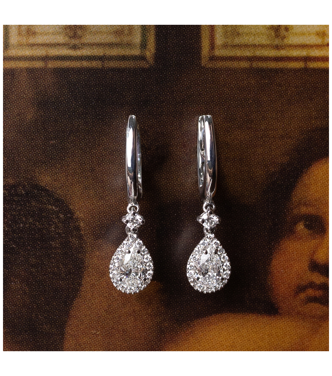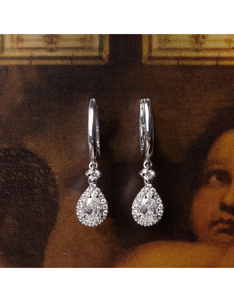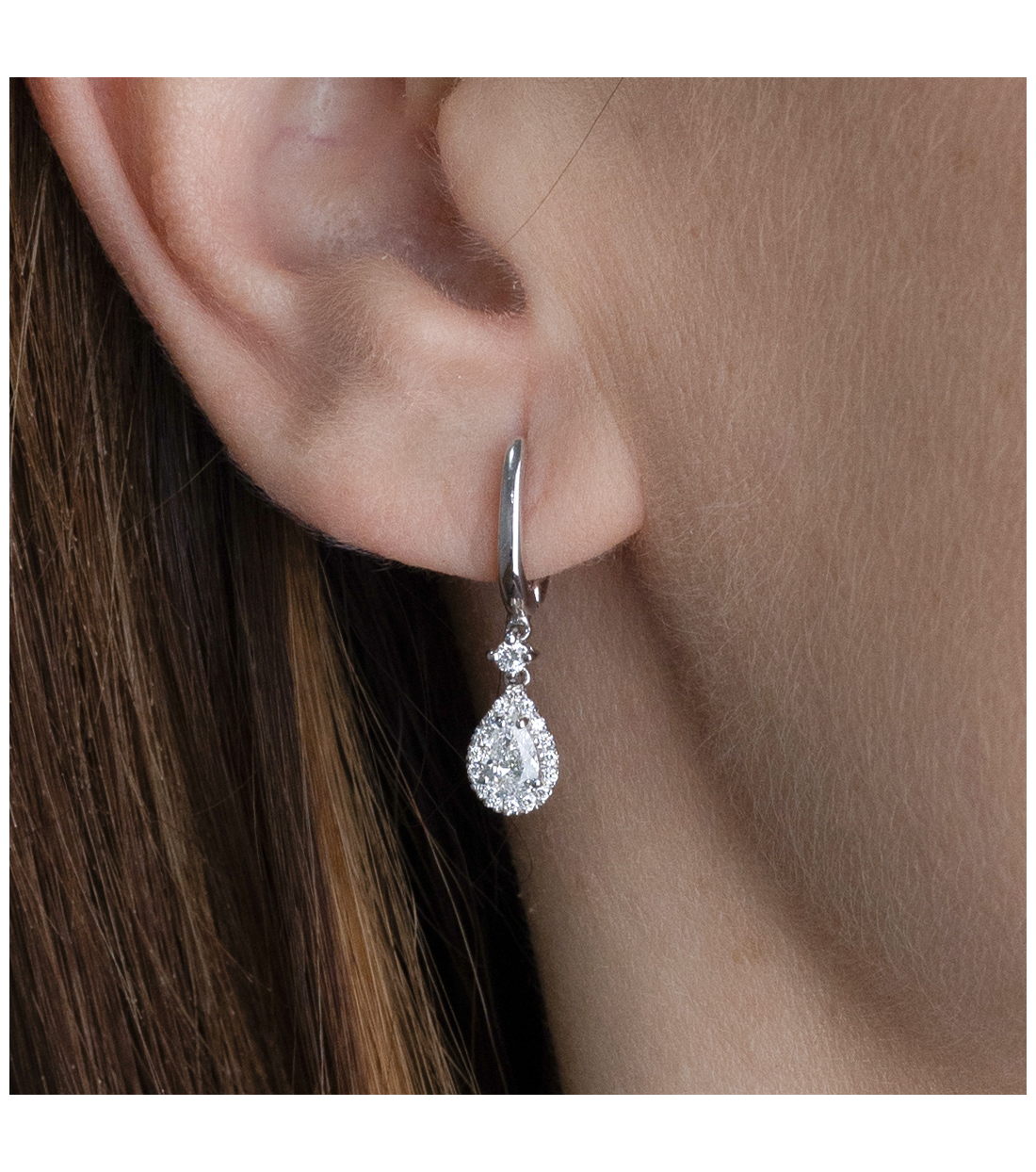White gold ‘Luz’ wedding earrings with pear-cut central diamond (0.50 ct.) and round-cut diamond bezel set (0.19 ct.). Elegance and sophistication in one piece.