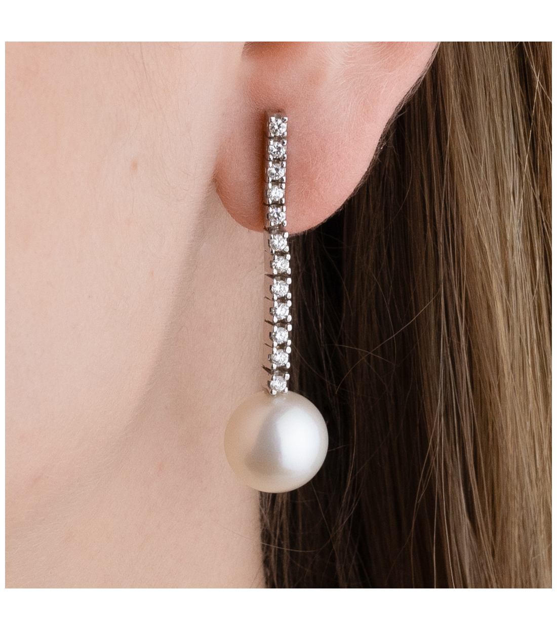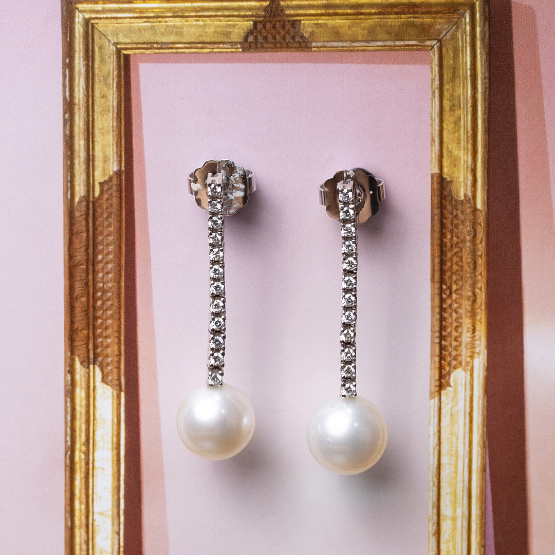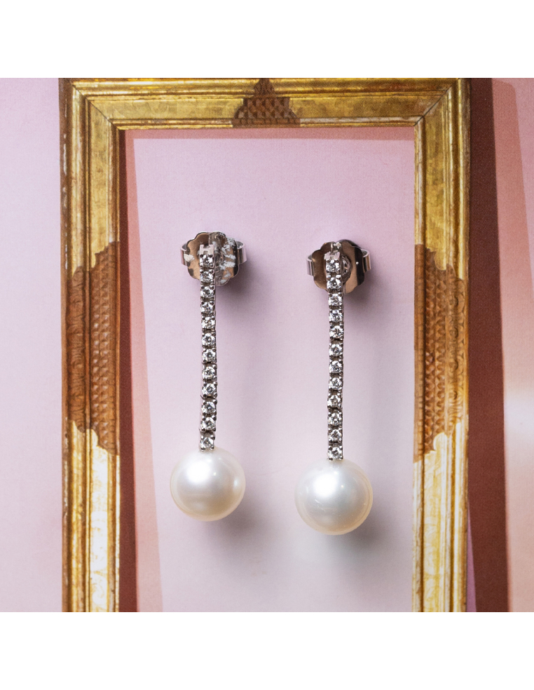 Alma’ earrings in white gold with a band of brilliant-cut diamonds and pearls. Elegance and Sophistication in Every Movement