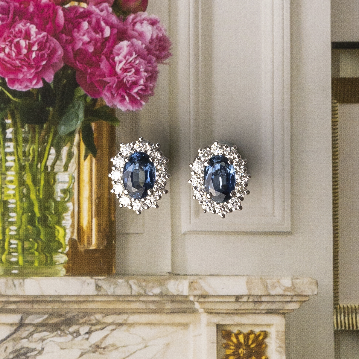 Almudena’ earrings in white gold with sapphires and diamond bezel set. A timeless and elegant design that enhances any look.