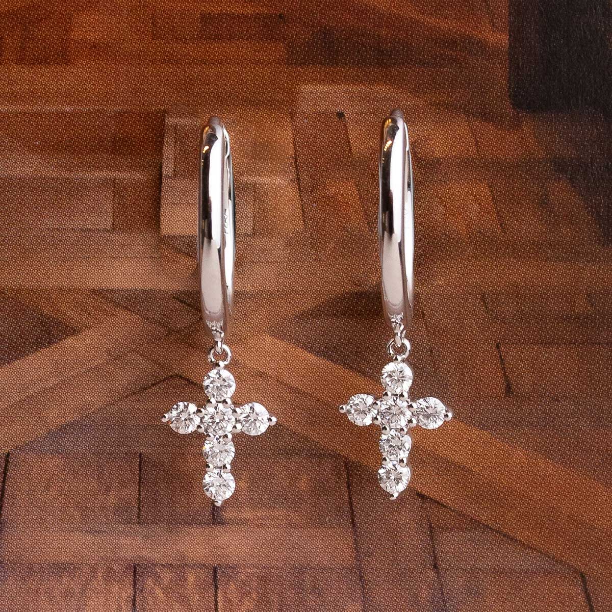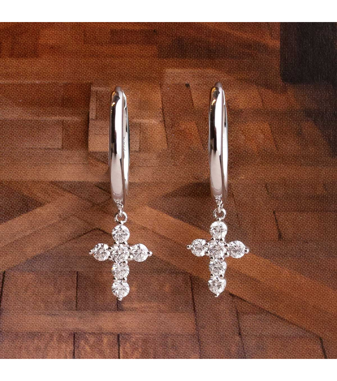 "Fayruz" earrings composed of a hoop and cross in 18 kt white gold and 0,30ct round-cut diamonds. A symbol of elegance and faith.