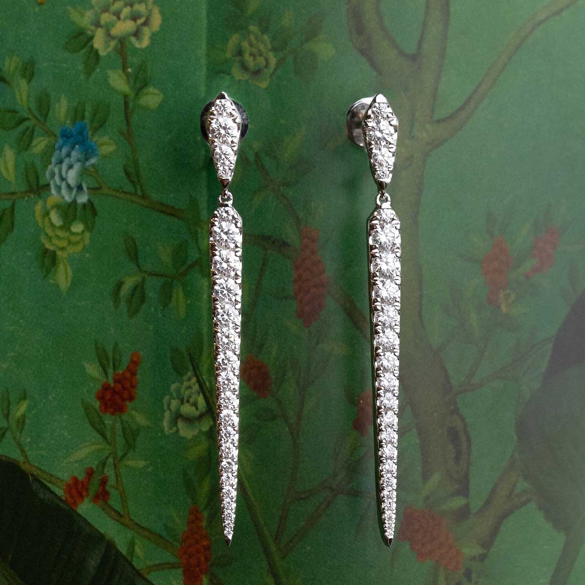 Long "Kimiko" earrings in white gold with 1.37 ct round-cut diamonds. Elegance and sophistication in a single piece.