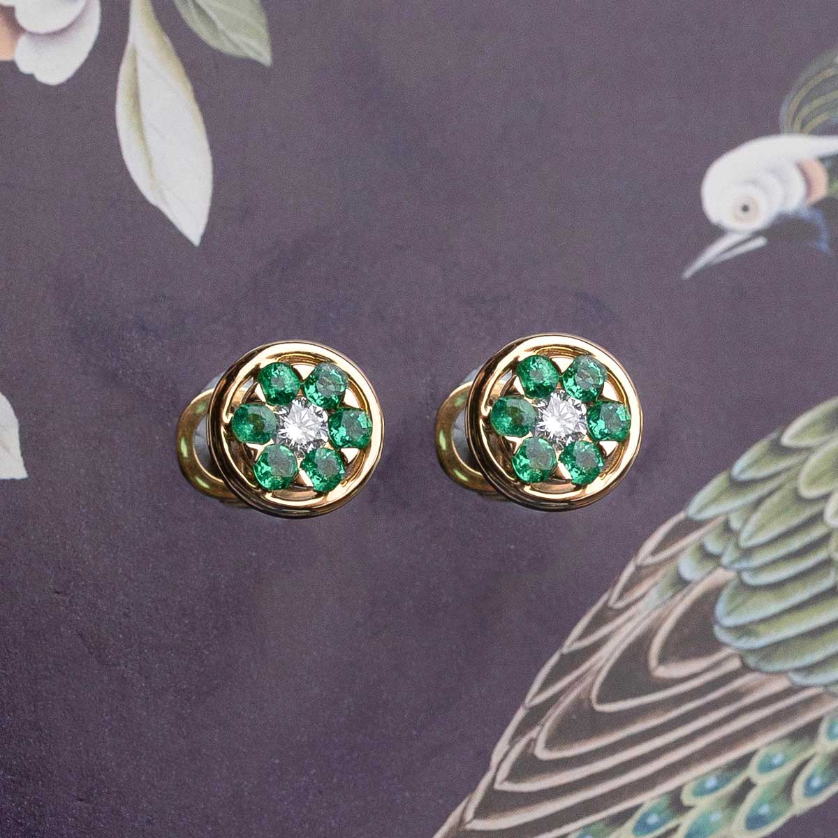 Iniya" earrings in 18kt yellow gold with 0.21 ct. round-cut diamonds and 0.49 ct. round-cut emeralds. A design that encapsulates natural beauty and timeless sophistication.