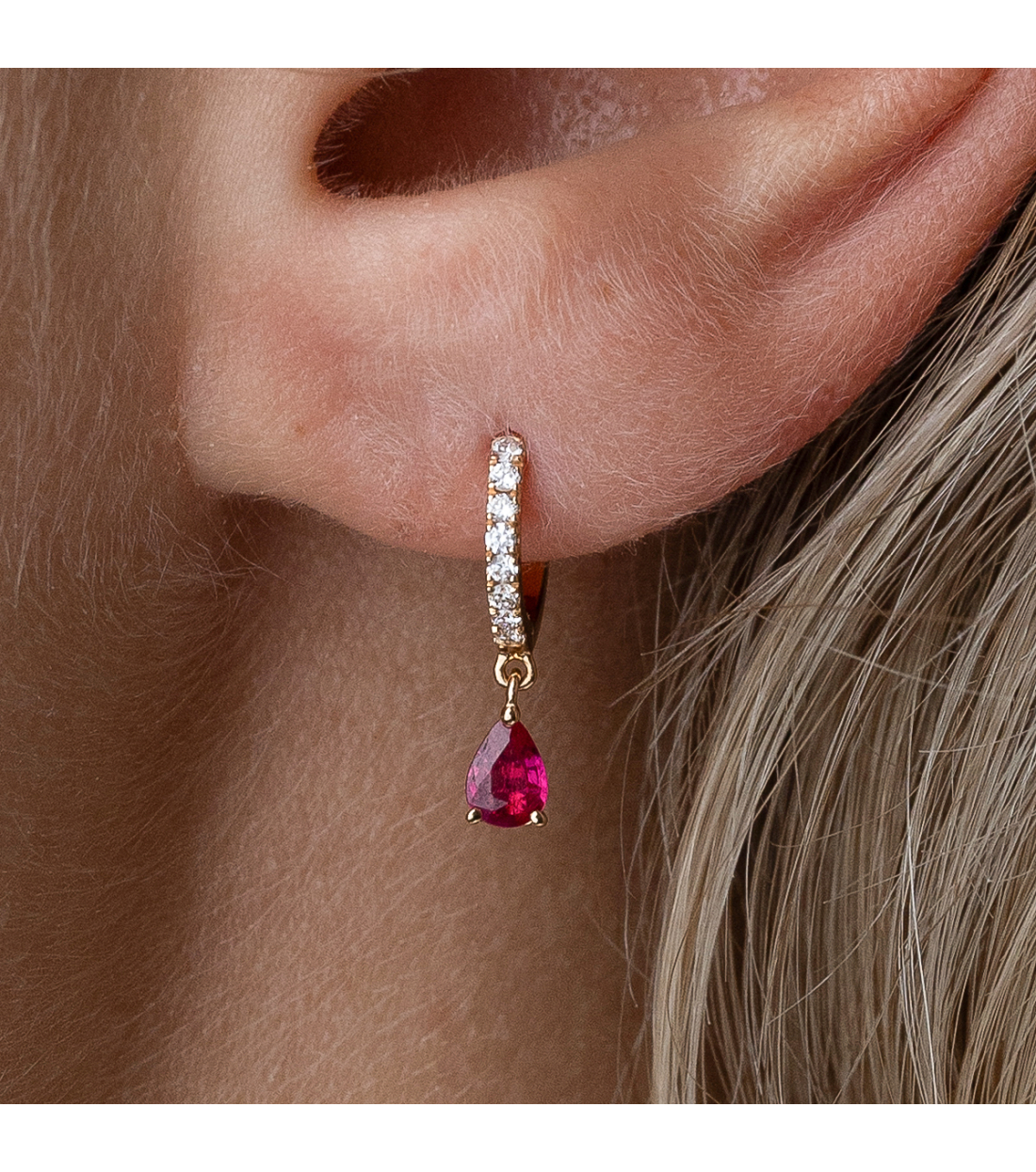 ‘Olaya’ earrings in 18K rose gold, composed of a mini hoop with 0.10 cts. round-cut diamonds and a 0.38 cts. pear-cut ruby pendant. Sophistication in every detail.