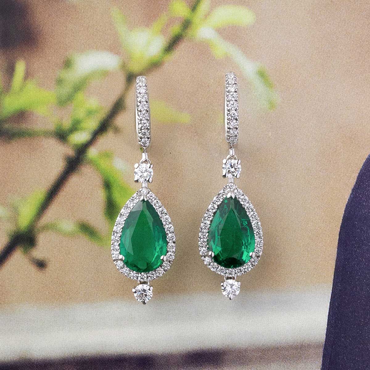 ‘Tania’ earrings in 18-carat white gold with 1.06 carats of round-cut diamonds and 3.91 carats of pear-cut emeralds. For a triumphant entrance, where luxury, design and presence come together in an unforgettable piece of jewellery.