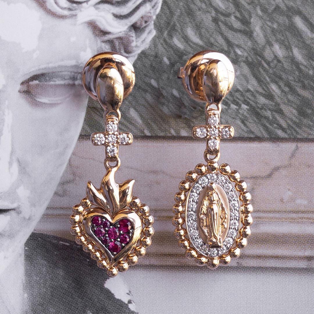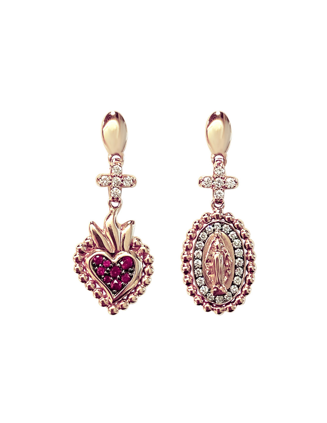Asymmetrical earrings “Gea” in 18kt rose gold, heart with rubies and beveled virgin with diamonds. Asymmetrical Elegance for a Triumphal Entry.