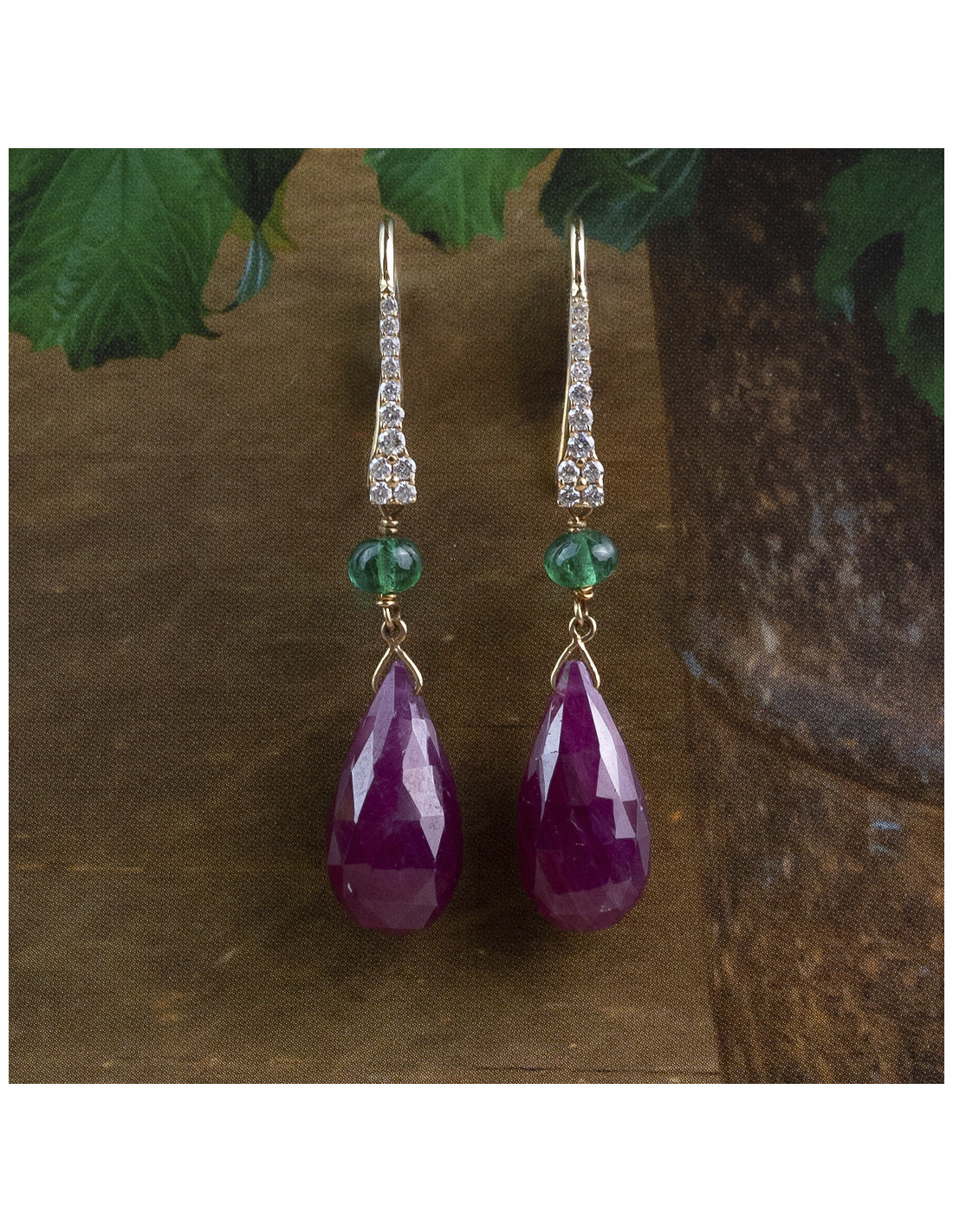 Alba" earrings in 18kt rose gold with briolette ruby, emeralds and diamonds. A symphony of colour and brilliance.