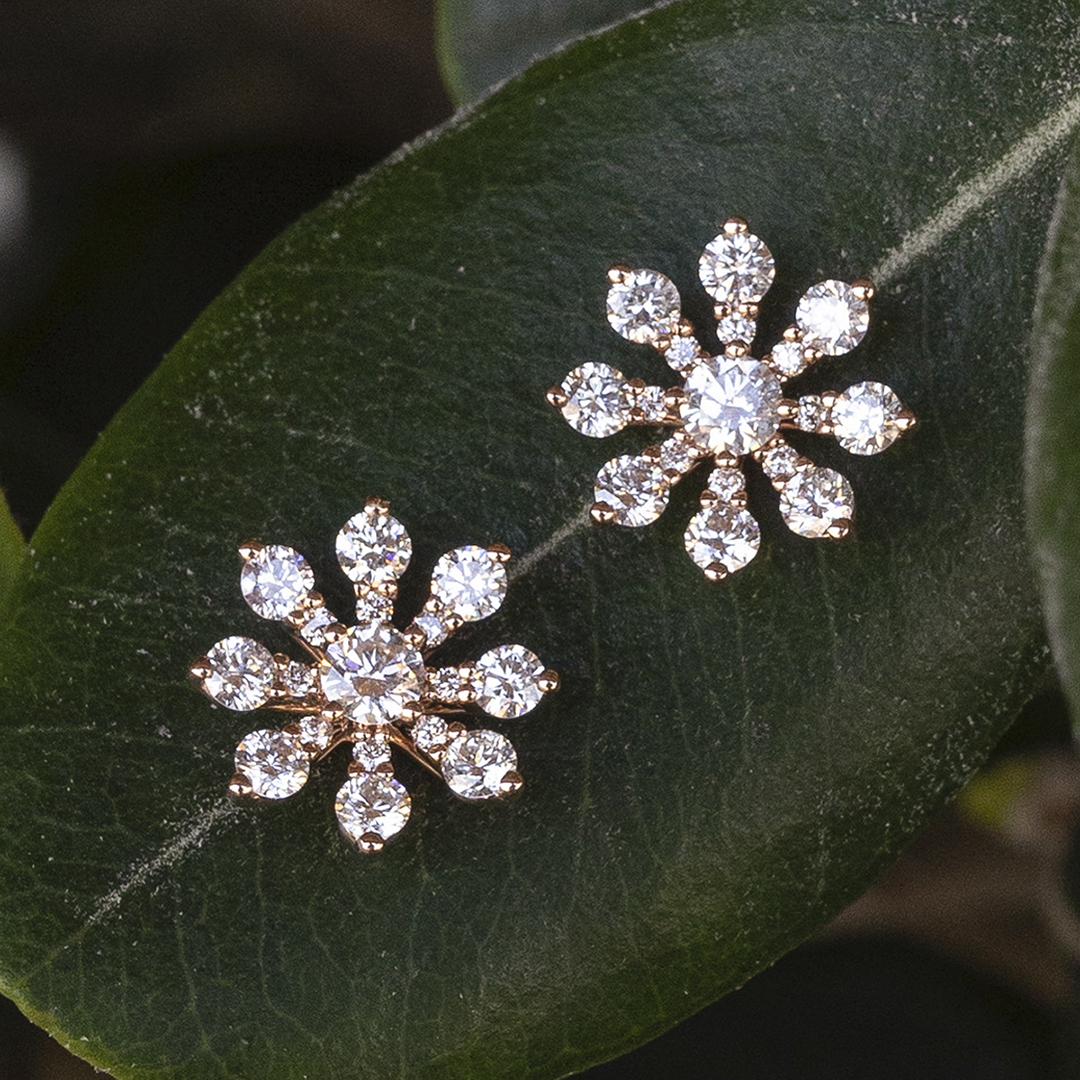 Earrings “Rocio” in 18kt rose gold and round-cut diamond flower. A Symbol of Beauty and Finesse.