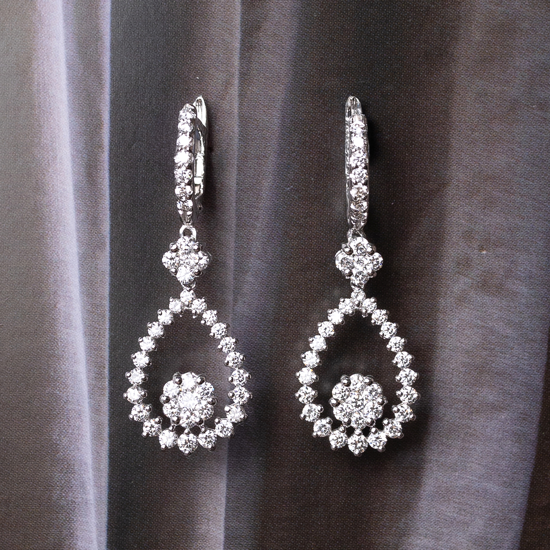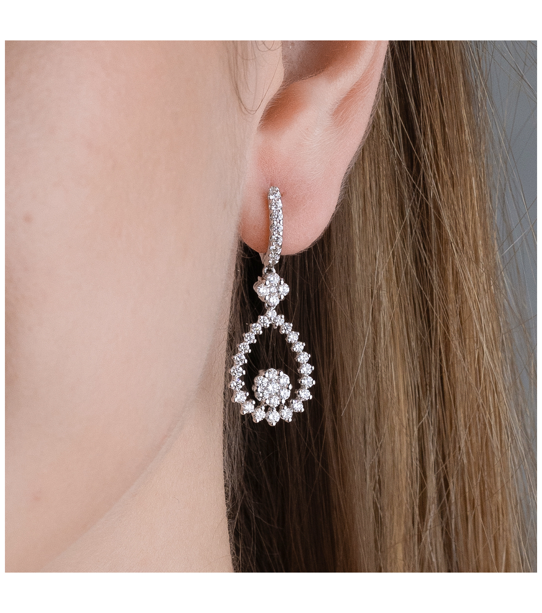 Elisa’ long earrings in white gold with round-cut diamonds (1.80 ct.). Their dazzling brilliance makes them the ideal accessory for any wedding dress.
