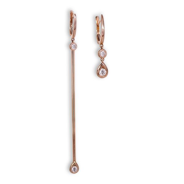 Asymmetrical earrings “Carlota” in 18kt rose gold with round-cut diamonds. Radiant elegance for a triumphant entrance.