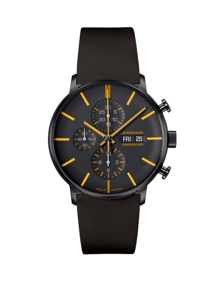Clear lines and expressive colour combinations are the hallmarks of the Junghans FORM A Chronoscope watch. The interplay between matt and polished surfaces in deep black creates an exciting dynamic. The details in yellow, grey or orange are inspired by a work of art by the British artist Richard Macneil, which is printed on the back of the transparent glass base of the case. This mechanical chronograph is equipped with a flat sapphire crystal and is water-resistant to 5 bar.