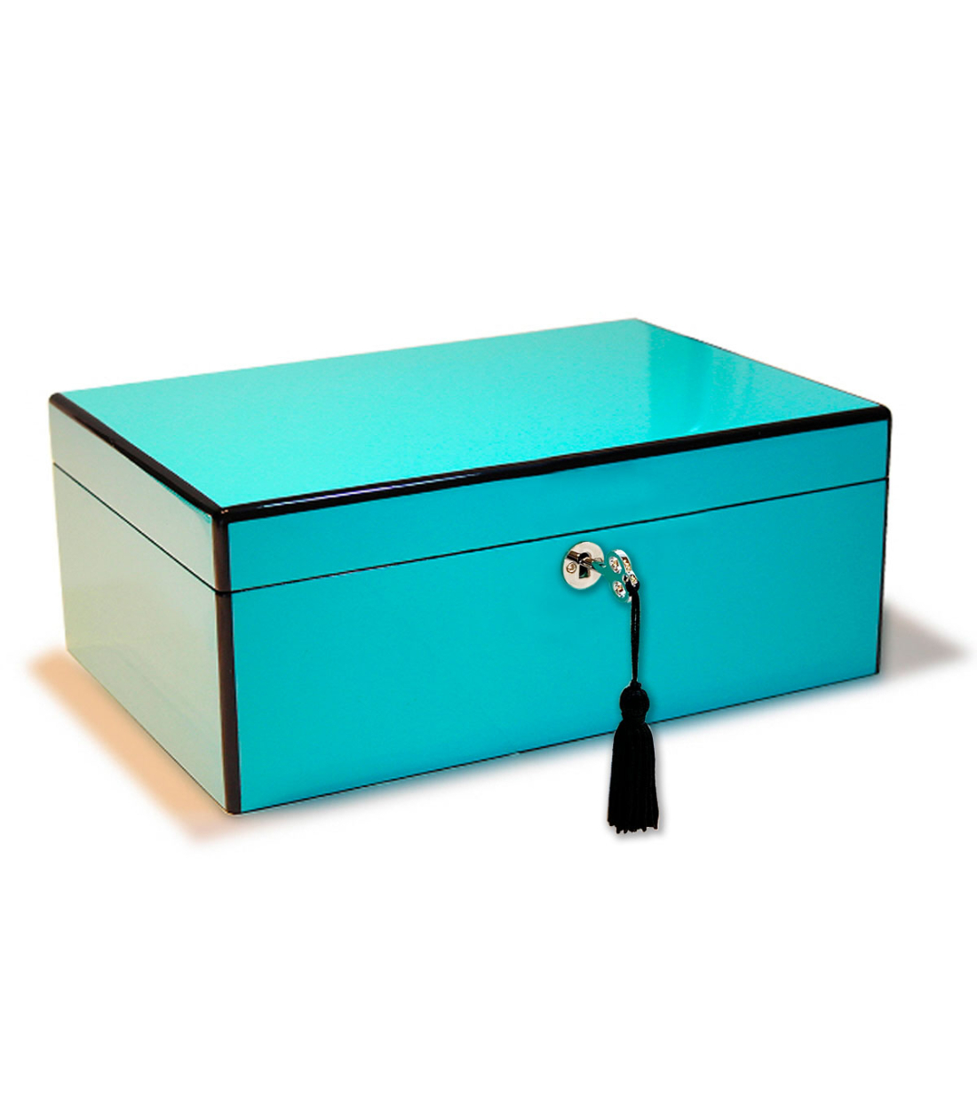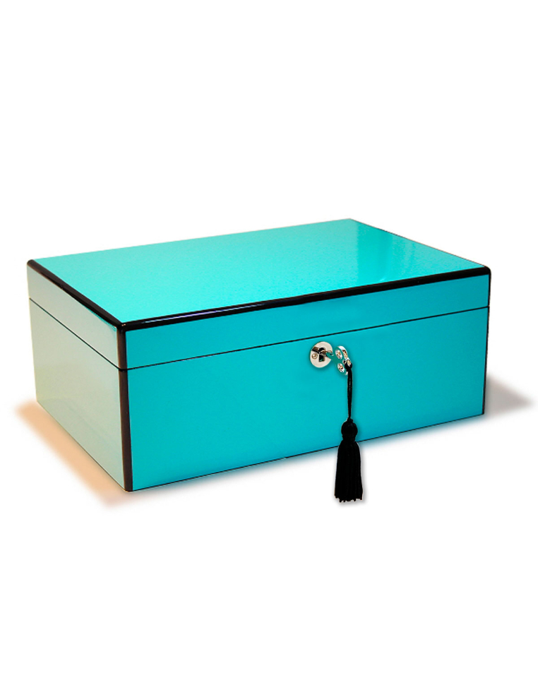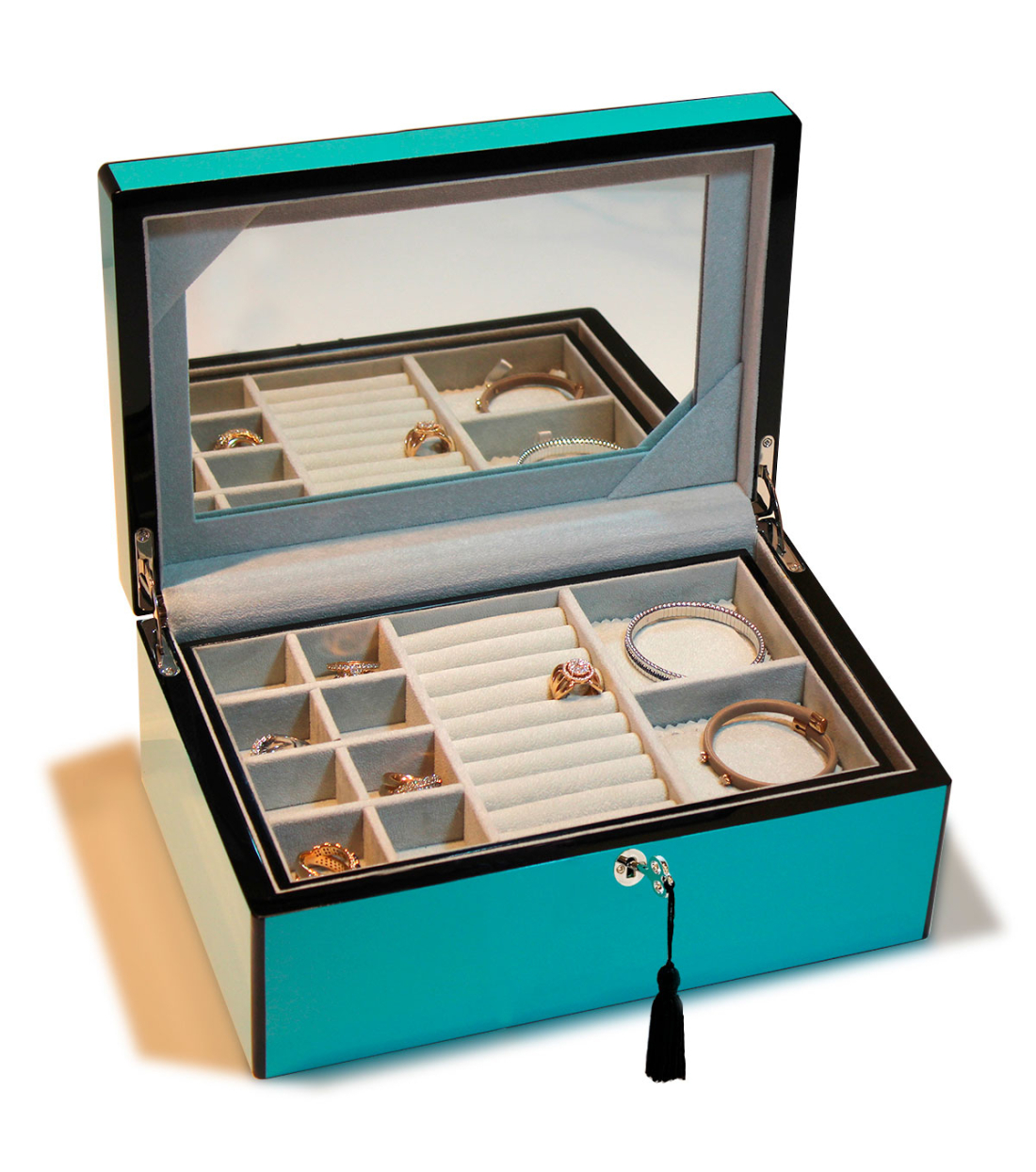 Turquoise ultra gloss lacquered jewellery box with double compartment and front mirror. Security lock with key. Its sophisticated design and luxury finishes will protect your jewellery with delicacy.