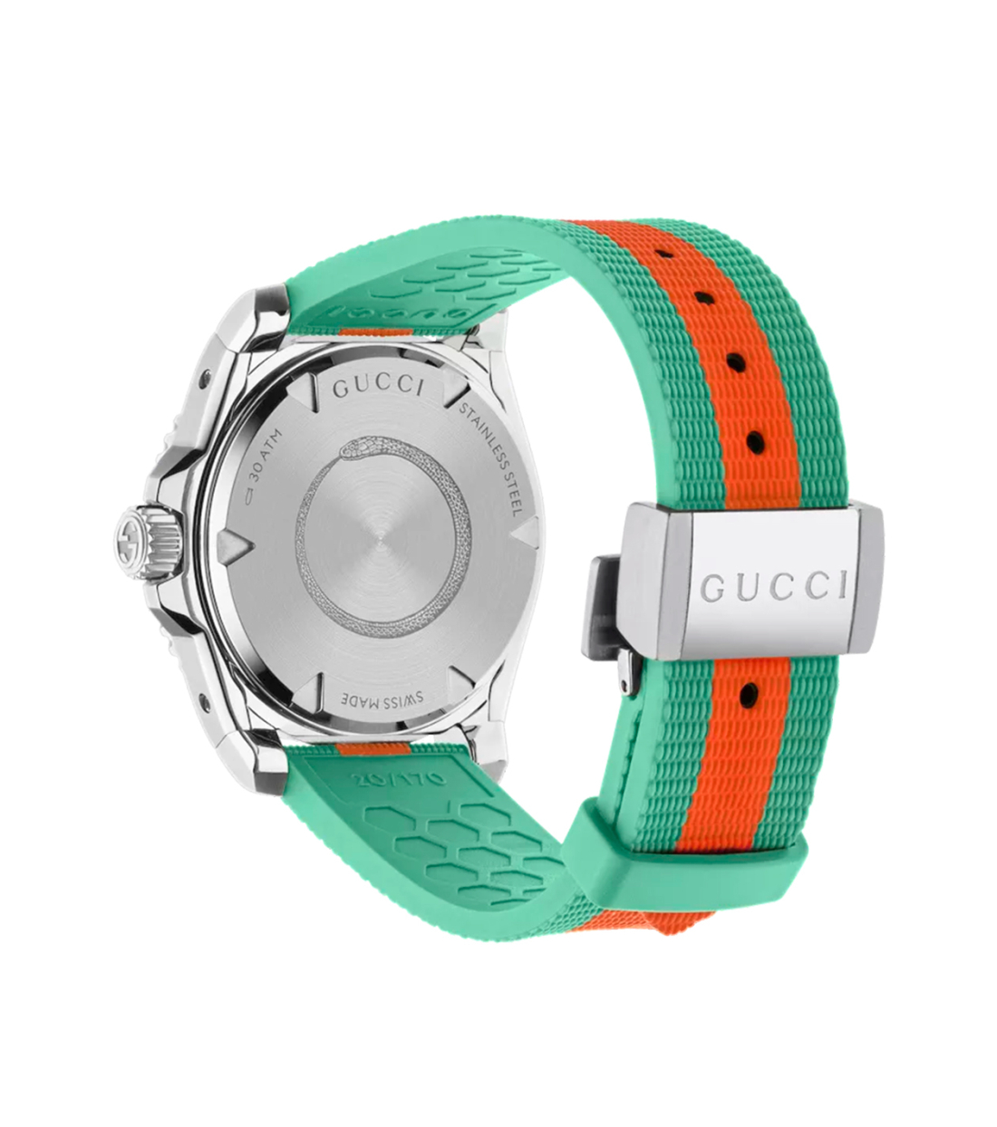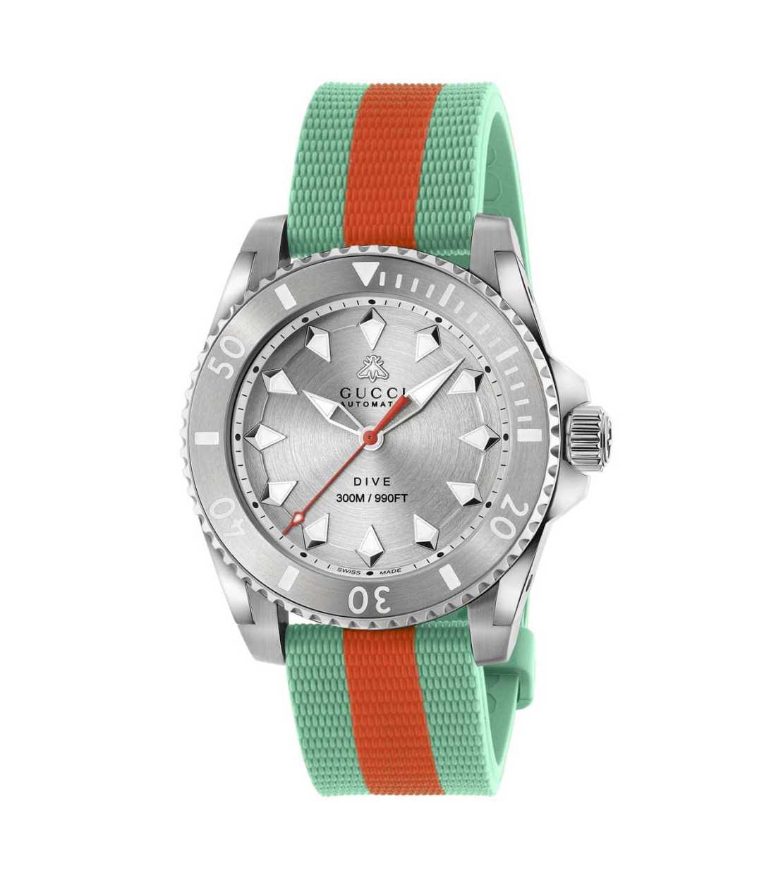 A new addition to the Dive family, the watch combines the signature symbolic elements of the brand: the Web triband and the Gucci bee. A silver dial with the iconic bee motif defines this accessory, designed with a steel case and bezel. A rubber strap with a turquoise and orange Web triband completes the look.