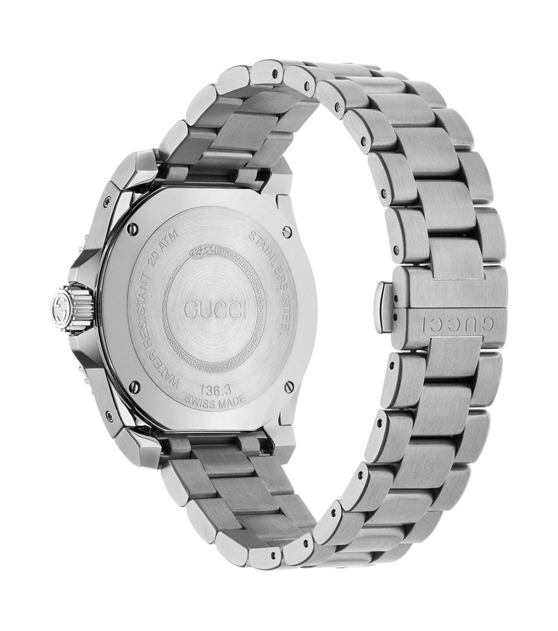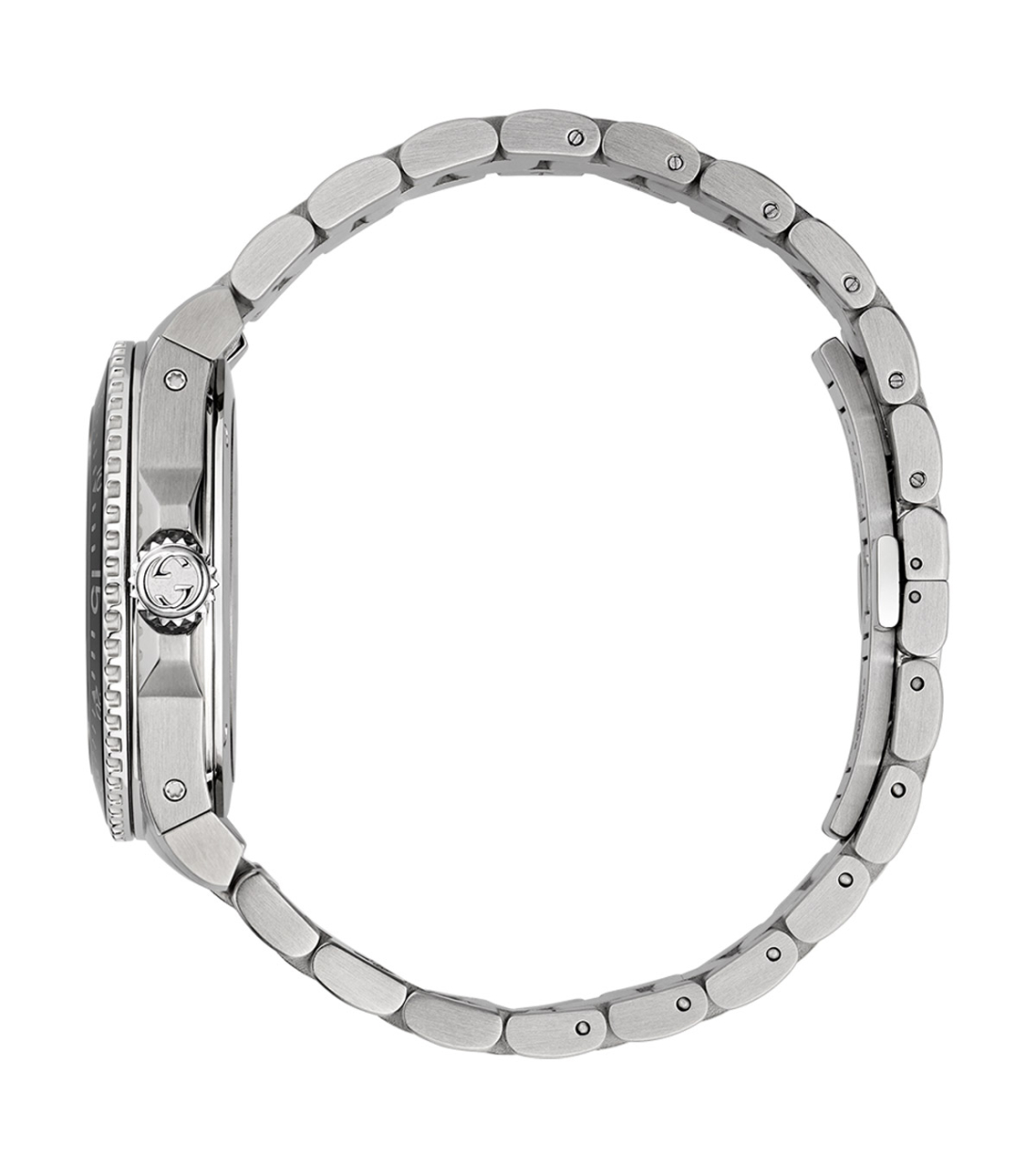 With a silhouette that reflects the iconic details of diving watches, the Gucci Dive offers a contemporary feel thanks to the matte black dial and steel link strap.