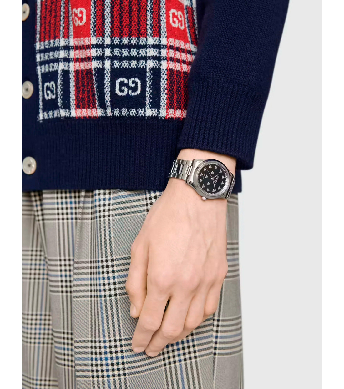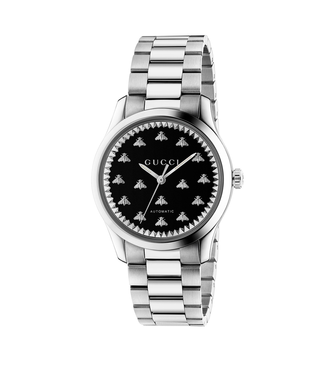 Part of the G-Timeless collection, this automatic watch is designed with a black onyx stone dial, enriched with silver-toned indexes that take the form of the Gucci bee—a distinctive code of the House. The case continues into a steel bracelet that wraps around the wrist.