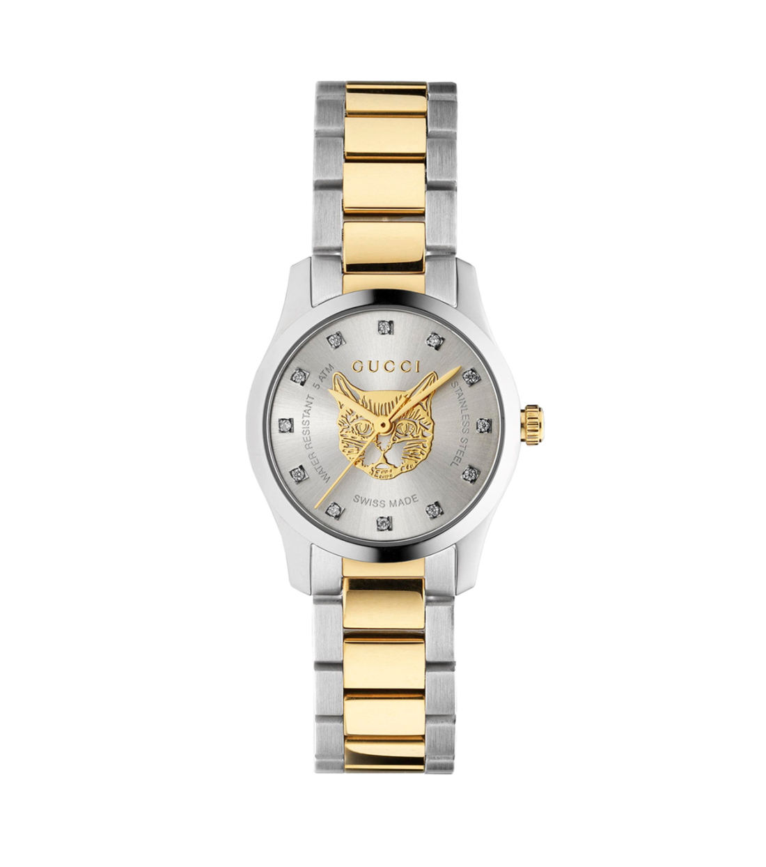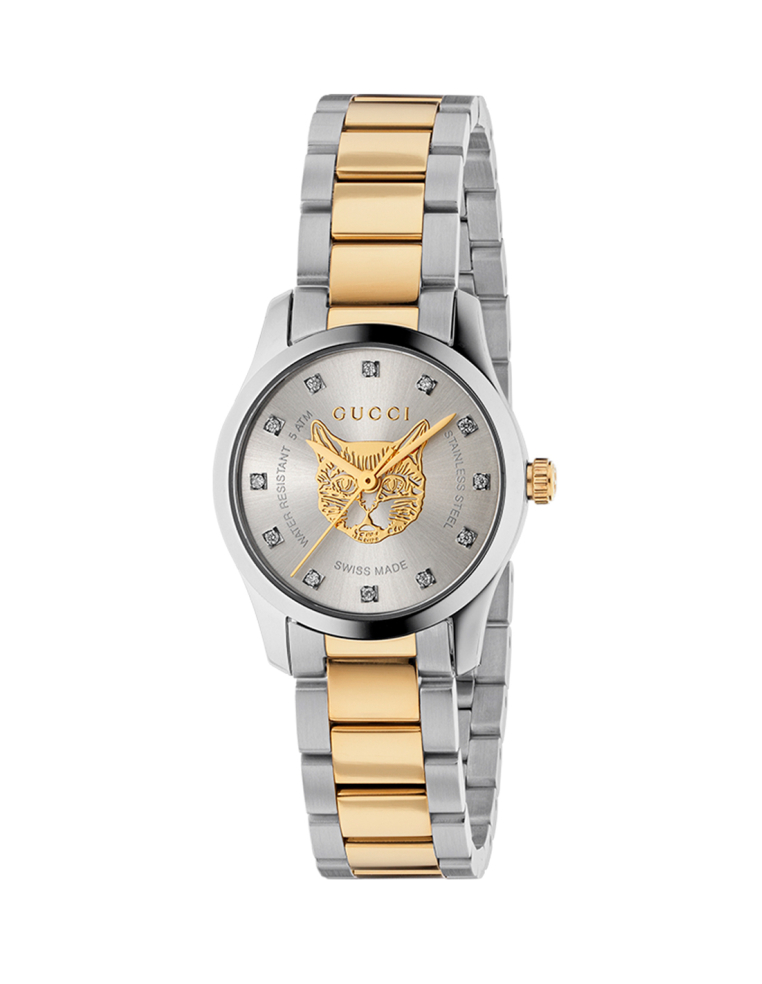 Stainless steel case, silver-plated dial with yellow gold feline head motif, stainless steel and yellow gold PVD bracelet.