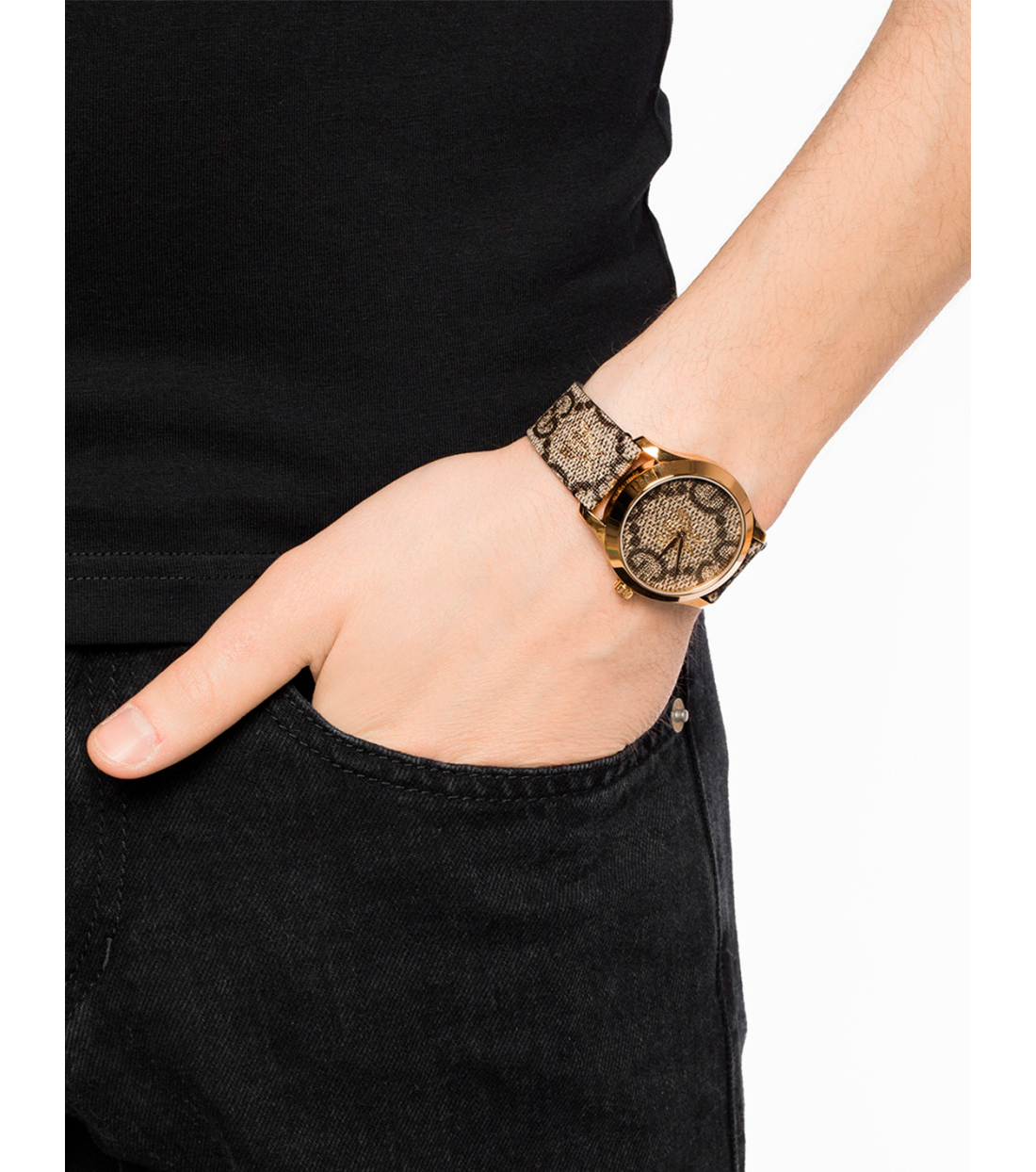 Gucci G-Timeless Md unisex watch. It is a two needle analog watch with multicolored leather strap and buckle closure. The case of this watch in stainless steel in golden color. The water resistance is 50 meters (5atm). It works with quartz movement. The crystal of the dial is scratch resistant Sapphire and with anti-reflective treatment in the interior combines the logo of the brand with multicolored print and golden colored hands. The diameter of the sphere is 38 millimeters.