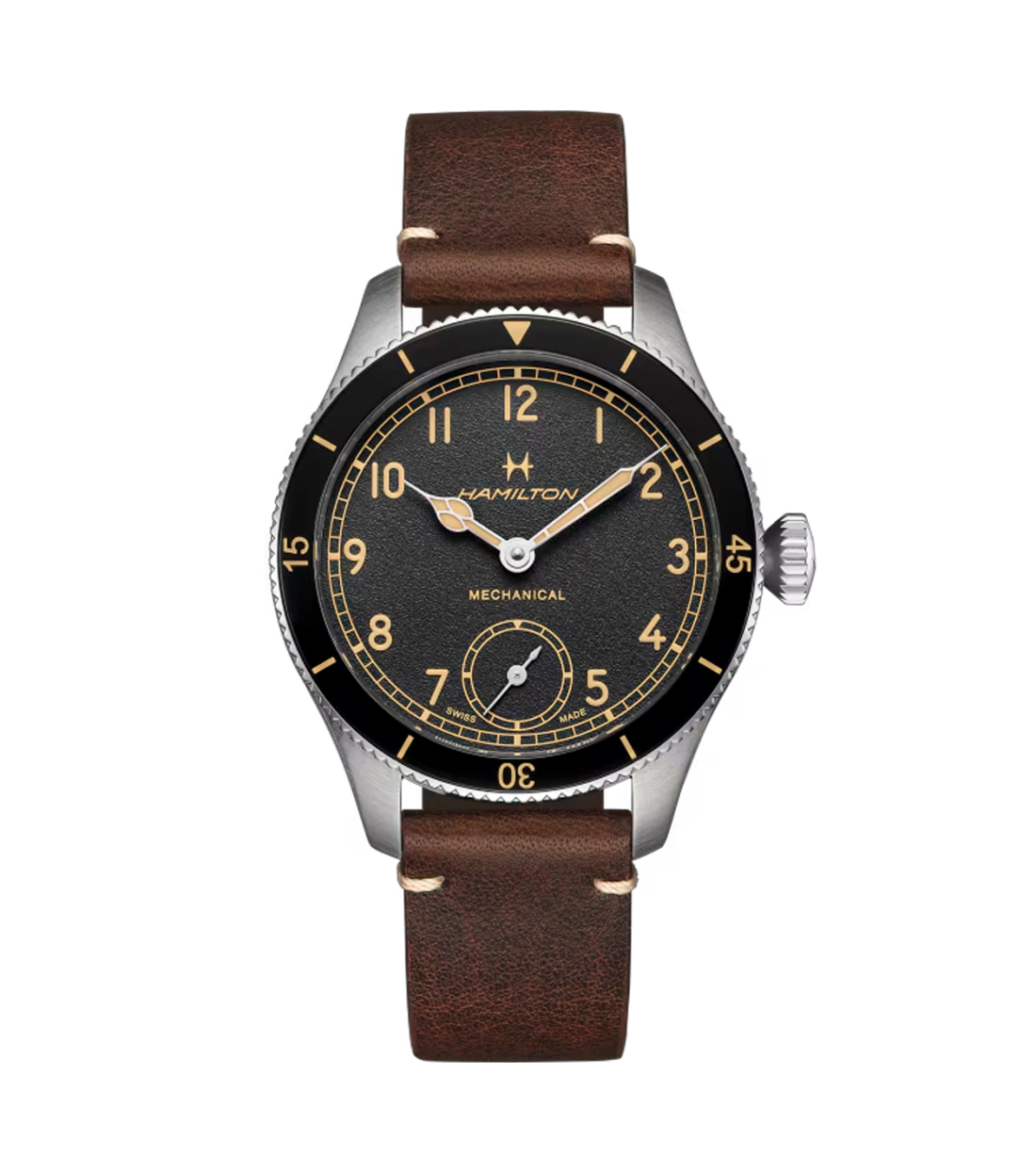 Inspired by the Model 23, an avant-garde pocket watch worn by American soldiers during World War II, the distinctive design of the Khaki Pilot Pioneer pays homage to Hamilton's military and aviation heritage. This sporty yet refined pilot's watch has an unmistakable technical design that can be seen through its hand-wound mechanism, bi-directional rotating bezel and prominent crown. This 43 mm watch is ready to fly when fitted with an elegant stainless steel case or an exclusive bronze case.
