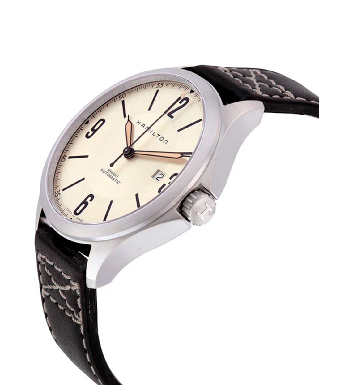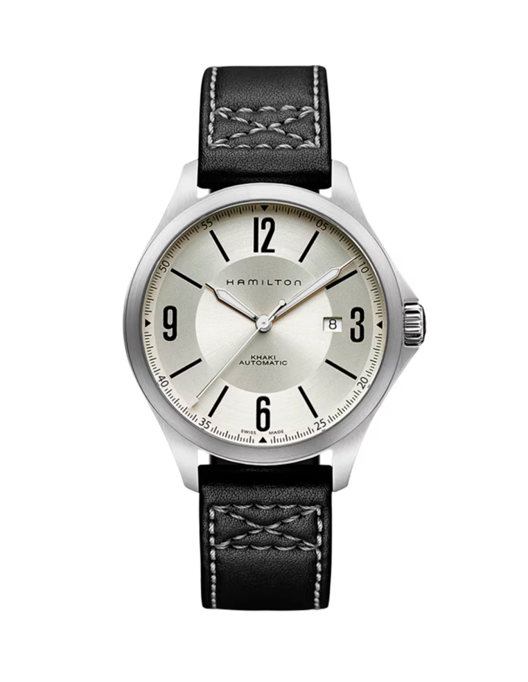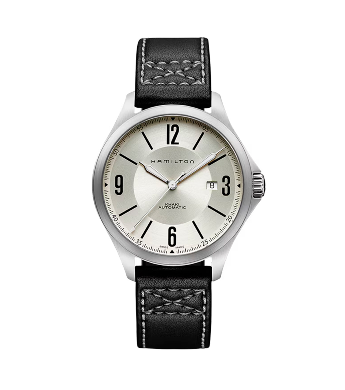 Powered by an automatic movement, the Khaki Aviation Auto is ready for adventure. The big numbers and indexes recall the pilot's necessity to read watches with ease while in flight.