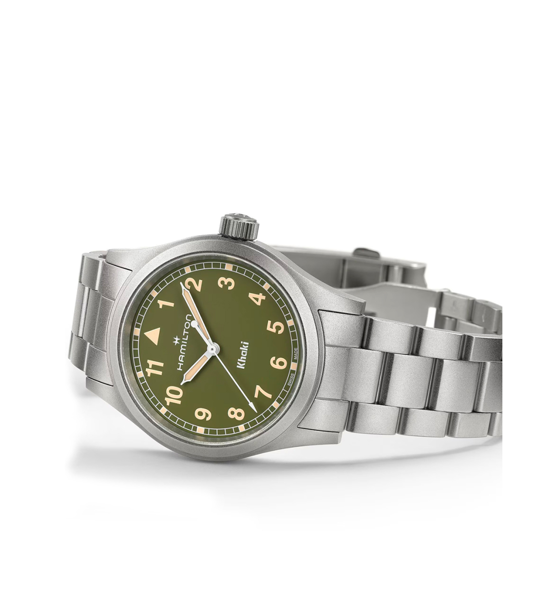 Ready for adventure, the Khaki Field Quartz is a reliable and rugged companion, ready to explore new horizons. Drawing on our reputation for precision, innovation and functional design, the Khaki Field Quartz combines a 38mm khaki green dial with a modern metal bracelet. Discover our Khaki Field collection.