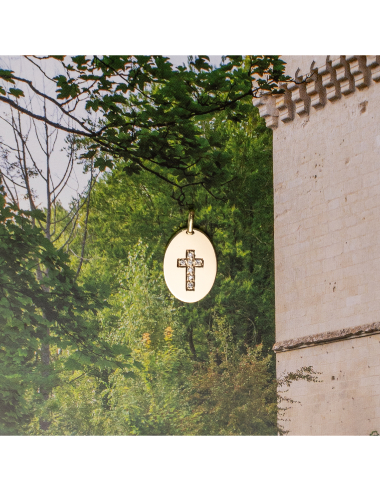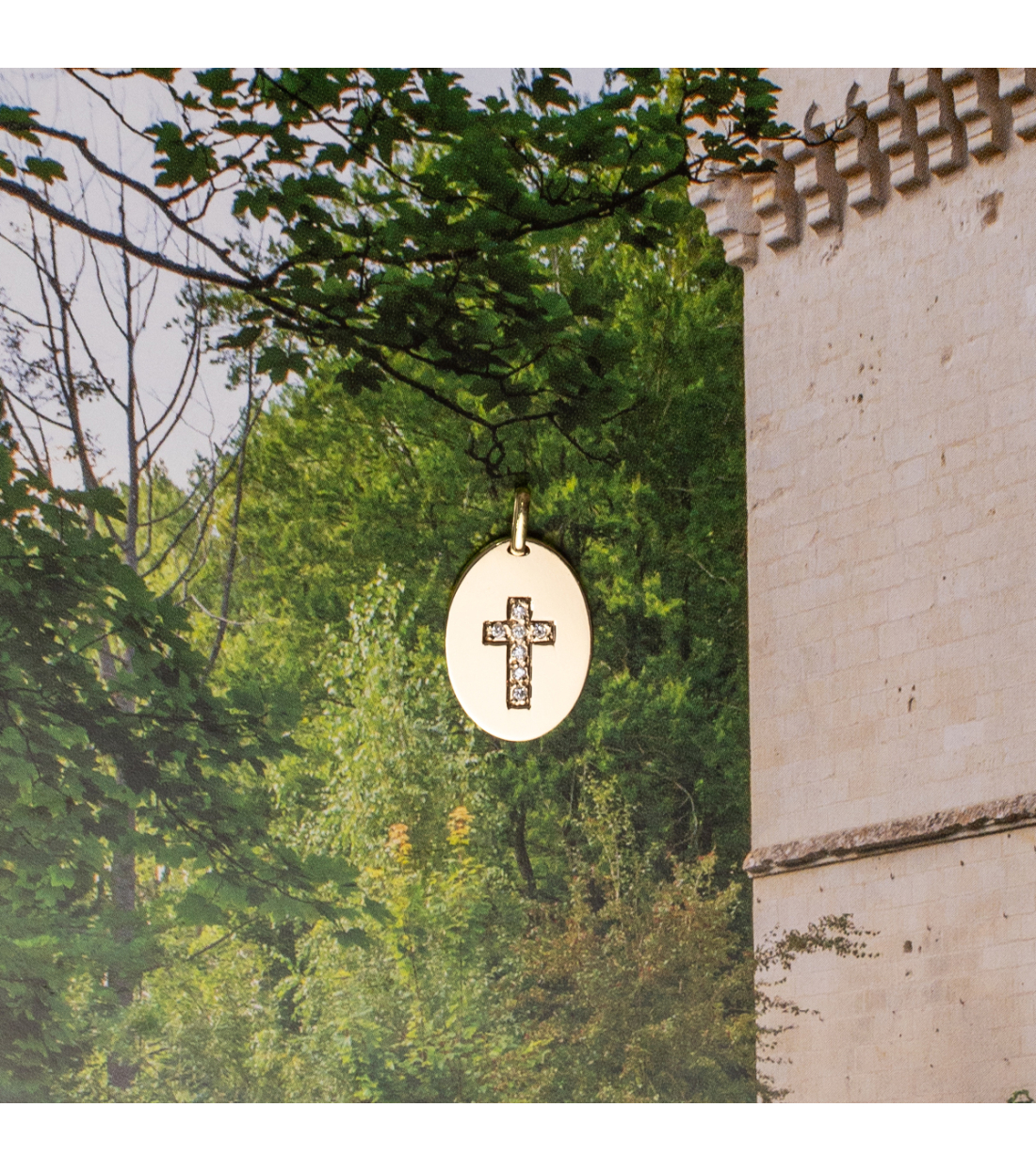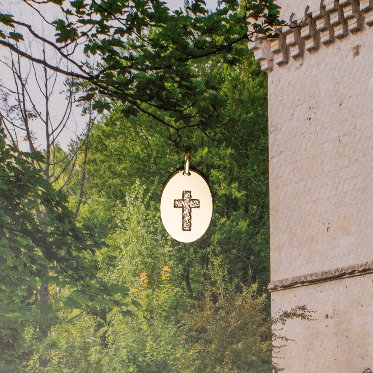 Oval yellow gold “Yael” pendant with round-cut diamond cross. The perfect gift to express your faith and style!