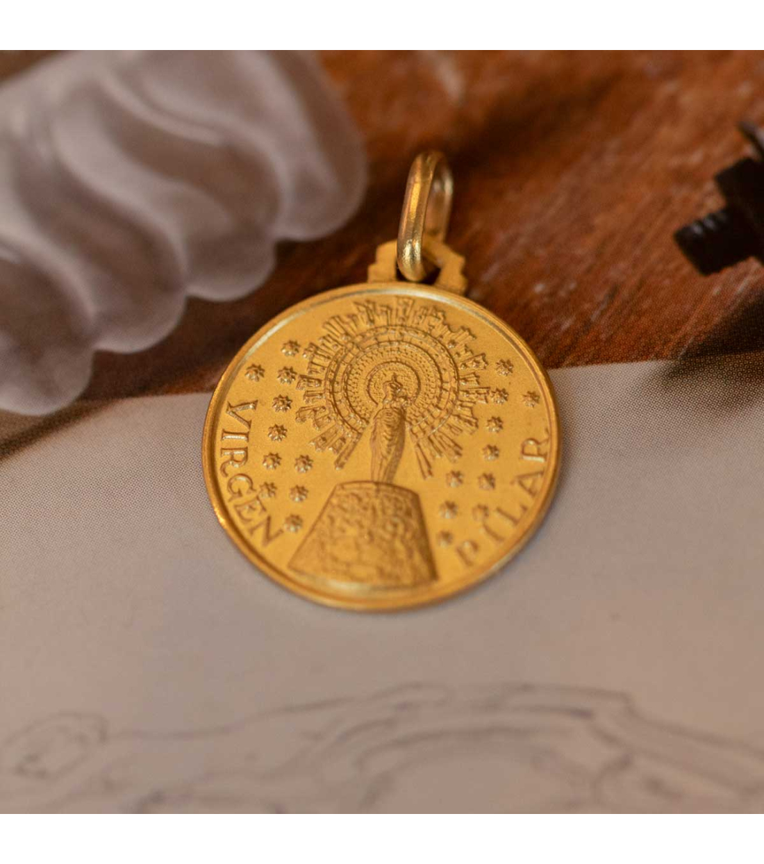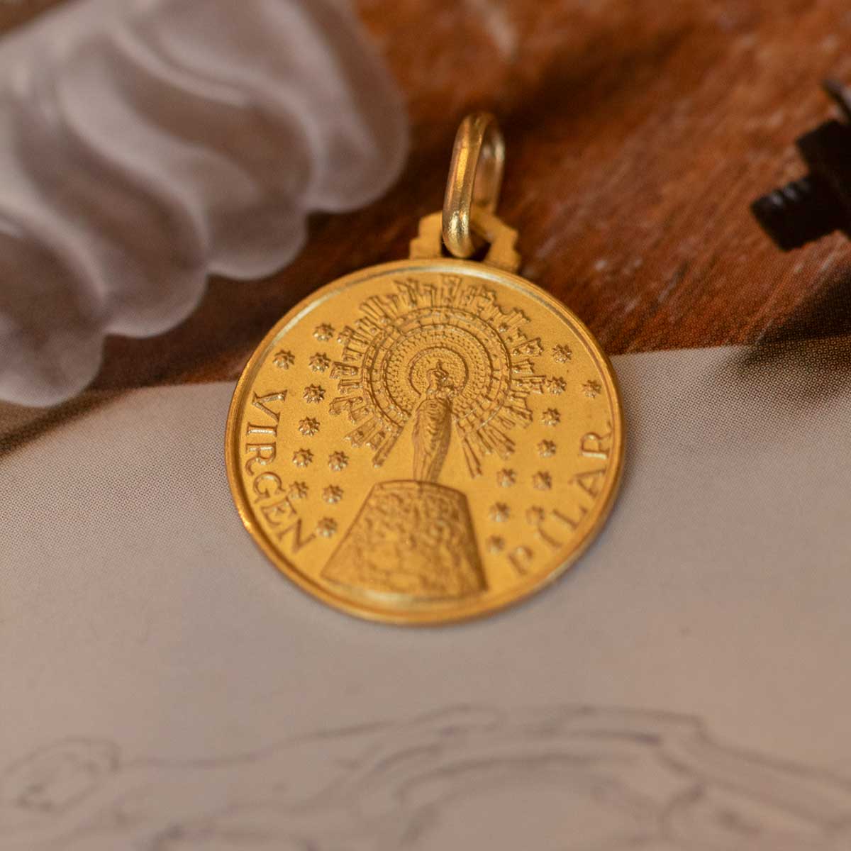 “Virgen del Pilar” pendant in 18K yellow gold. Medal diameter 18mm, weight 4g. Strength, faith, and unity of the Hispanic peoples.