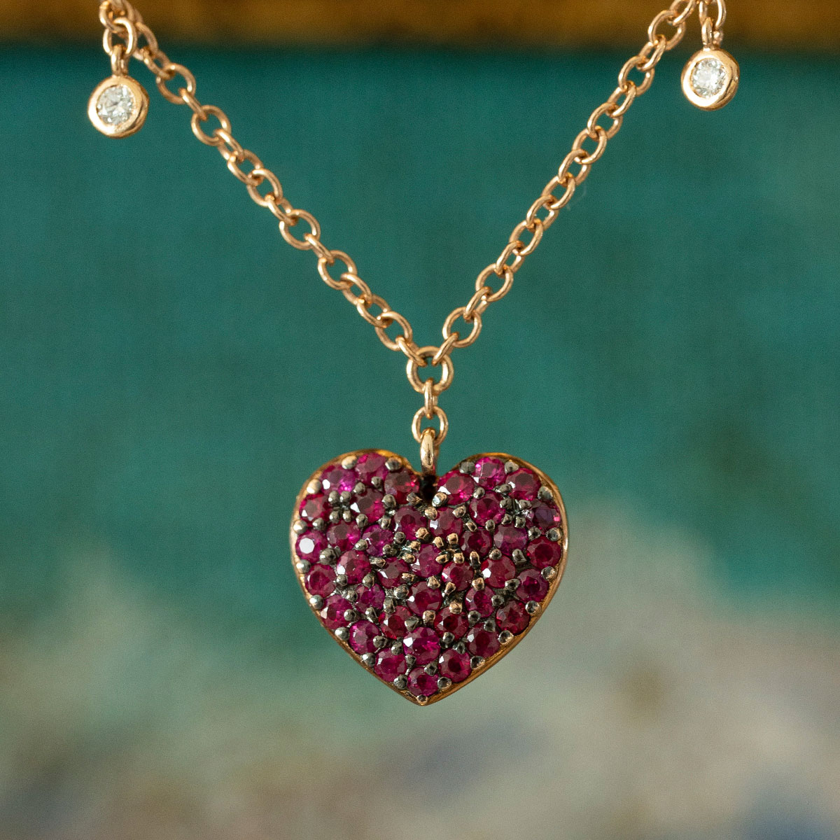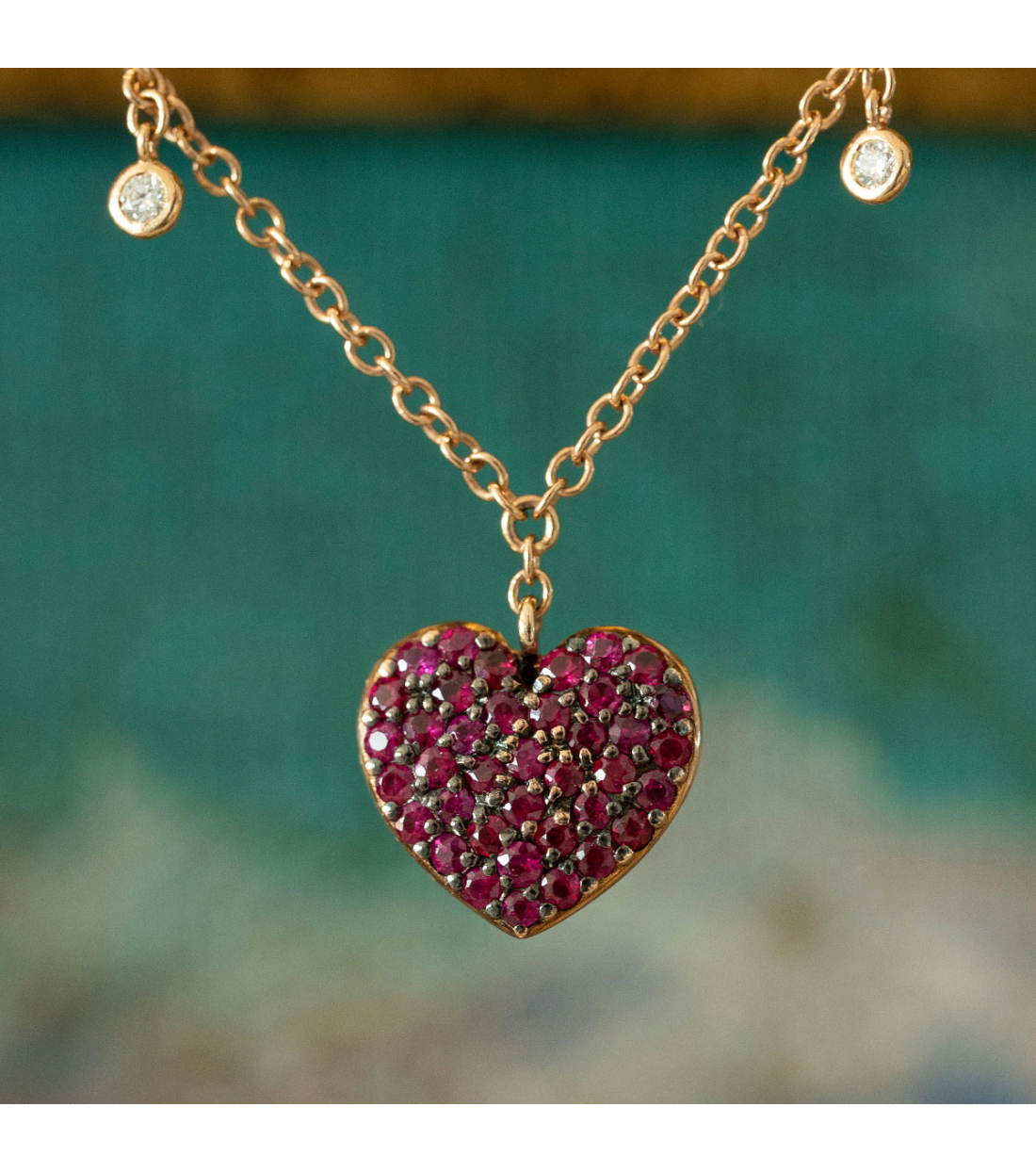 Patricia’ choker consisting of a rose gold chain with round-cut diamond chatons (0.08 cts) and a rose gold heart pendant with round-cut rubies (0.58 cts). An exclusive design that enhances your natural beauty.
