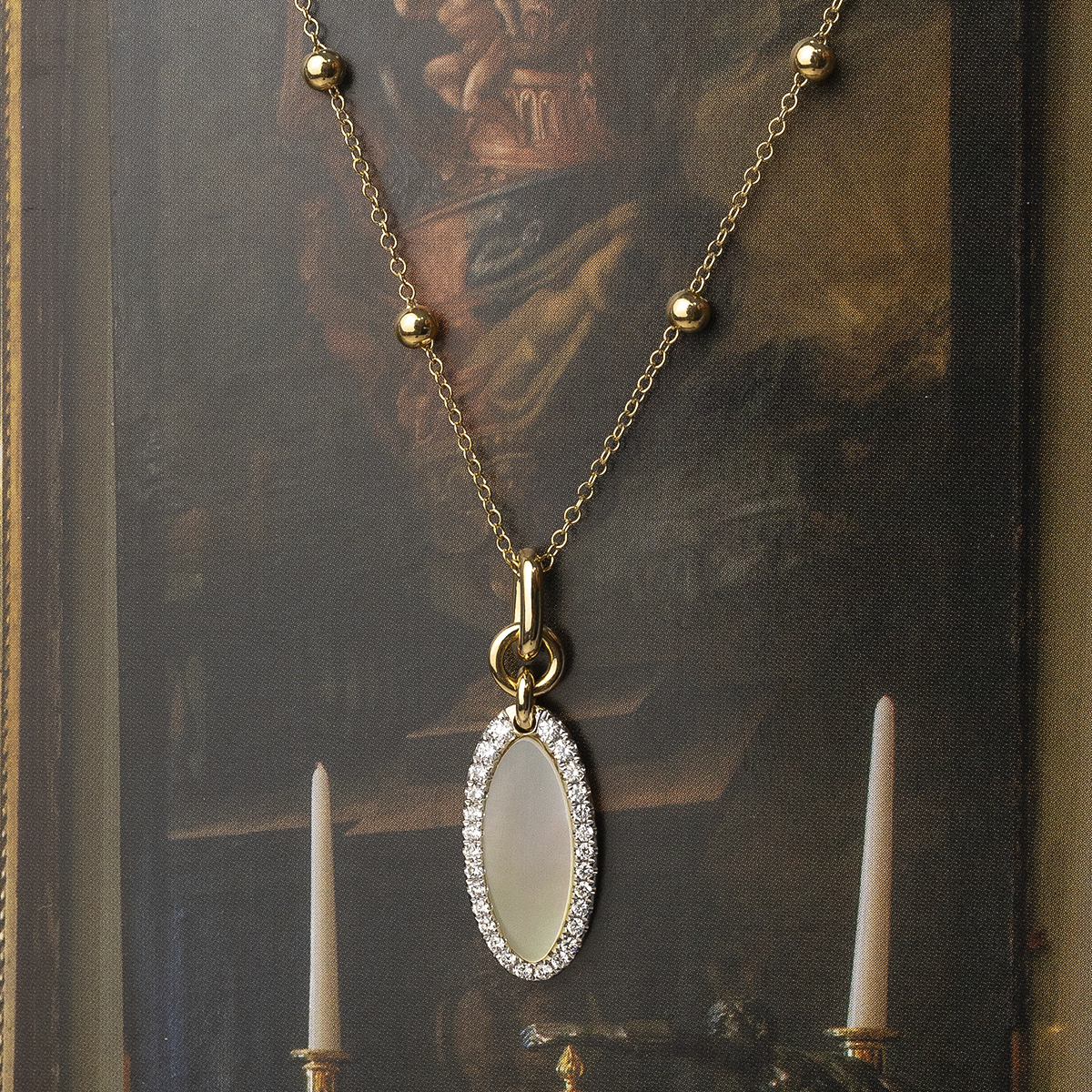 Lorena’ necklace in 18kt yellow gold with mother-of-pearl oval and diamond bezel. Timeless elegance with a modern twist.